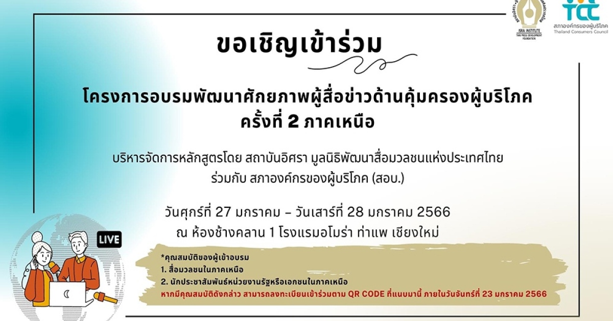 สถาบันอิศราขอเชิญสื่อมวลชนในภาคเหนือเข้าร่วมโครงการอบรมพัฒนาศักยภาพผู้สื่อข่าวด้านคุ้มครองผู้บริโภค