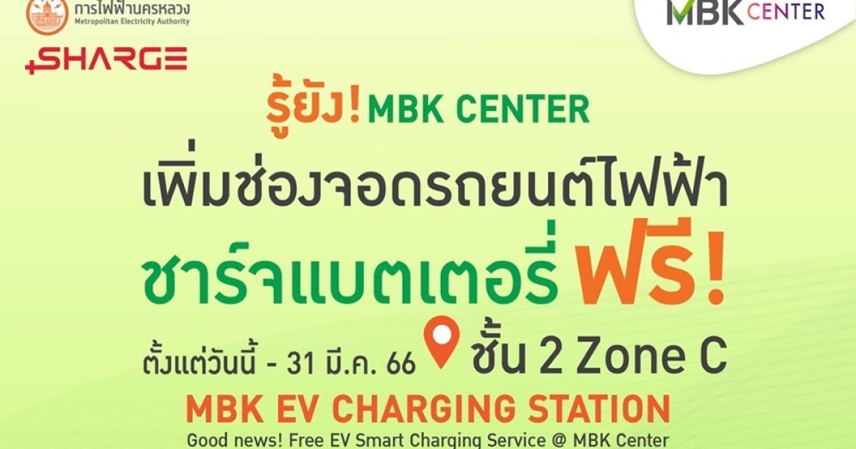 เอ็ม บี เค เซ็นเตอร์ เพิ่มช่องชาร์จรถยนต์ไฟฟ้า MBK EV Charging Station พร้อมชาร์จฟรี! ตั้งแต่วันนี้- 31 มี.ค. 66