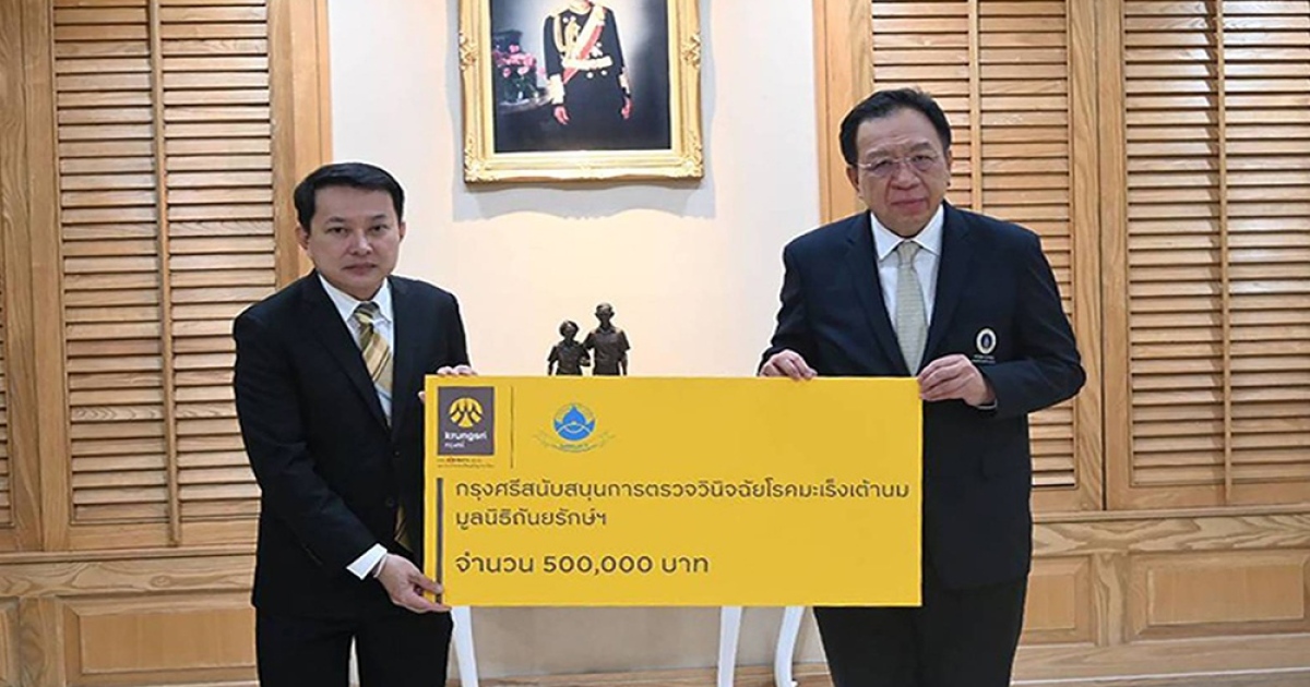 กรุงศรี (ธนาคารกรุงศรีอยุธยา จำกัด (มหาชน)) โดย นายพูนสิทธิ์ ว่องธวัชชัย (ซ้าย) ผู้ช่วยกรรมการผู้จัดการใหญ่ ผู้บริหารสายงานการพัฒนาด้านสิ่งแวดล้อม สังคม และธรรมาภิบาลสู่ความยั่งยืน ธนาคารกรุงศรีอยุธยา จำกัด (มหาชน) มอบเงินจำนวน 500,000 บาท เพื่อสนับสนุนมูลนิธิถันยรักษ์ ในพระราชูปถัมภ์สมเด็จพระศรีนครินทราบรมราชชนนี ในการตรวจแมมโมแกรมคัดกรองมะเร็งเต้านมแก่สตรีด้อยโอกาส ต่อเนื่องเป็นปีที่ 13 โดยมี ศาสตราจารย์คลินิก นายแพทย์วิศิษฎ์ วามวาณิชย์ (ขวา) ประธานศูนย์ถันยรักษ์ เป็นผู้รับมอบ ณ ศูนย์ถันยรักษ์ โรงพยาบาลศิริราช