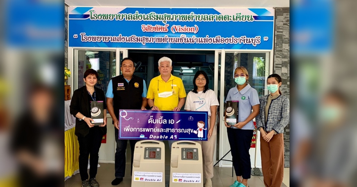 นายชาญวิทย์ จารุสมบัติ รองกรรมการผู้จัดการใหญ่ ดั๊บเบิ้ล เอ มอบเครื่องผลิตออกซิเจนและชุดหูฟังตรวจคนไข้ให้กับ โรงพยาบาลส่งเสริมสุขภาพตำบลลาดตะเคียน อำเภอกบินทร์บุรี จังหวัดปราจีนบุรี เพื่อให้บริการดูแลรักษาผู้ป่วยและประชาชนในพื้นที่ ตามโครงการ 'ดั๊บเบิ้ล เอ เพื่อการแพทย์และสาธารณสุข' โดยมี นายอัครเดช กัณหารี กำนันตำบลลาดตะเคียน พร้อมด้วยเจ้าหน้าที่โรงพยาบาล เป็นตัวแทนรับมอบ