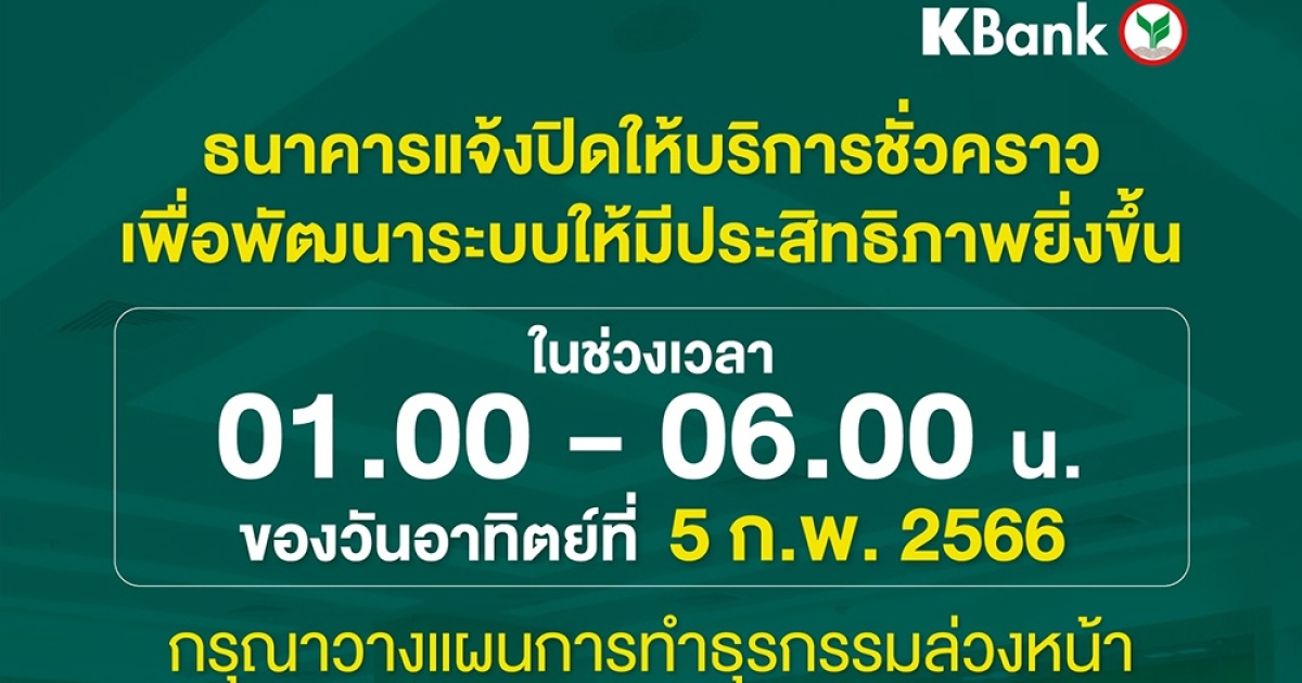 ธนาคารมีความจำเป็นที่จะต้องทำการปิดปรับปรุงบริการเป็นการชั่วคราว ในวันอาทิตย์ที่ 5 กุมภาพันธ์ 2566 ช่วงเวลา 01:00 น. - 06:00 น. ส่งผลให้ลูกค้าไม่สามารถใช้บริการดังนี้ได้