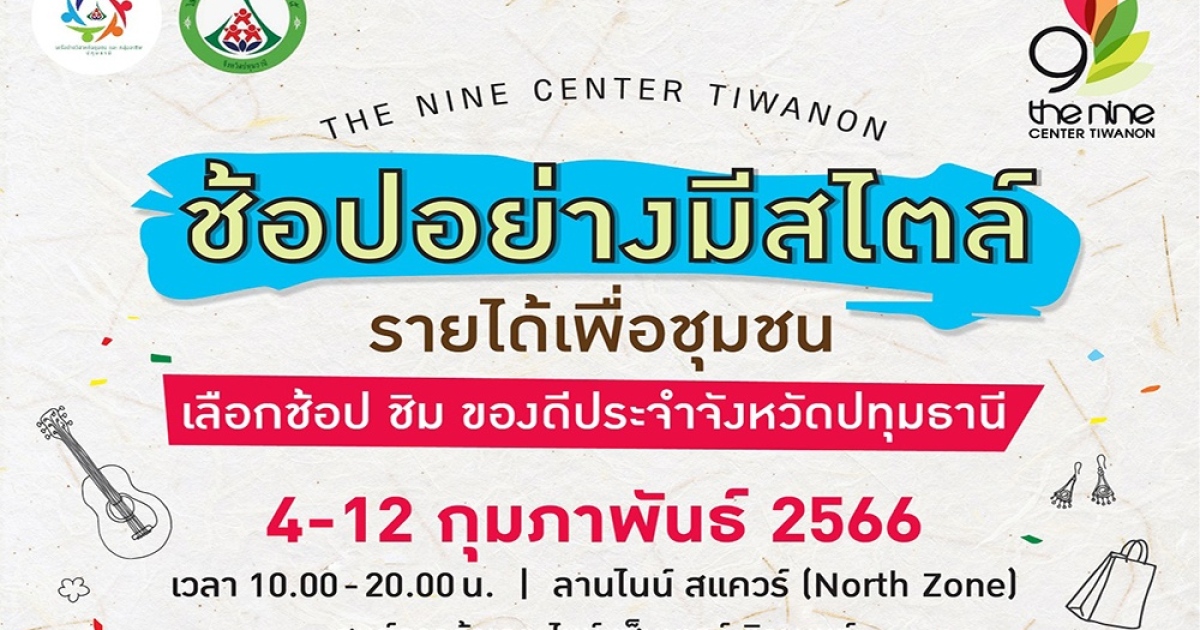 กลับมาอีกครั้ง! กับงาน 'ช้อปอย่างมีสไตล์ รายได้เพื่อชุมชน' เดอะไนน์ เซ็นเตอร์ ติวานนท์ ศูนย์การค้าในเครือเอ็ม บี เค เนรมิตพื้นที่เพื่อชุมชนได้นำสินค้าสินค้าวิสาหกิจชุมชนคุณภาพดี จังหวัดปทุมธานี ให้คุณได้มาช้อป ชิม เพลินกับหลากหลายสินค้าและผลิตภัณฑ์ชุมชนในราคาสุดพิเศษ อาทิ เสื้อผ้า ของใช้ ของฝาก มากกว่า อาทิ ผักปลอดสารและผลไม้ตามฤดูกาล สมุนไพรไทย นวดแผนไทย สินค้าเกษตรแปรรูป งานฝีมือต่าง ๆ ชุดผ้าฝ้าย ผ้าไทย เครื่องใช้จากไม้ ขนมของฝากจากชุมชน เป็นต้น พร้อมโปรโมชันสุดพิเศษ ลด 10% ทุกร้าน ทุกวัน หรือซื้อสินค้าในงานครบ 500 บาท รับฟรี! กระเป๋าใส่เหรียญแฮนด์เมด 1 ใบ และช้อปสินค้าภายในศูนย์การค้าฯ ครบ 300 บาทขึ้นไป สามารถนำมาแลกรับบริการนวดผ่อนคลาย ฟรี 15 นาที