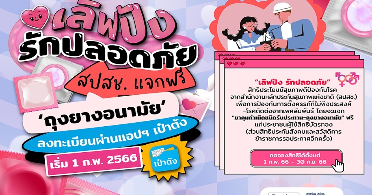 เริ่มแล้ววันนี้ 'เลิฟปัง รักปลอดภัย' สปสช.แจกฟรี 'ถุงยางอนามัย' เพื่อดูแลคนไทยวัยเจริญพันธุ์ ป้องกันภาวะท้องไม่พร้อม โรคติดต่อทางเพศสัมพันธ์ ขอรับได้ที่หน่วยบริการ สปสช. เพิ่มทางเลือกใหม่ เพื่อความสะดวกขอรับผ่านแอปเป๋าตัง พร้อมเตรียมเปิดตัวตู้จ่ายถุงยางอนามัยอัตโนมัติในวันวาเลนไทน์ 14 ก.พ. นี้ที่เมืองพัทยา