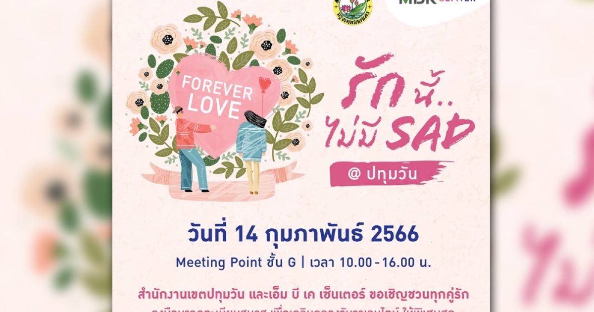 มาเริ่มต้นชีวิตคู่ที่สมบูรณ์ ควงคู่มาจดทะเบียนสมรส ลุ้นรับของรางวัลและของที่ระลึกในงาน “รักนี้ไม่มี SAD@ปทุมวัน” วันอังคารที่ 14 กุมภาพันธ์ 2566 เวลา 10.00 น. – 16.00 น. ณ บริเวณ Meeting Point ชั้น G (Zone A) ศูนย์การค้าเอ็ม บี เค เซ็นเตอร์