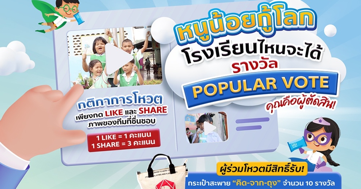 กติกาการโหวต เพียงกด Like (ไลค์) หรือ Share (แชร์) คลิปของ รร. ที่ชื่นชอบในอัลบั้มนี้ https://bit.ly/PopularVoteKidsSaveTheWorld (1 ไลค์ = 1 คะแนน และ 1 แชร์ = 3 คะแนน) ได้ตั้งแต่วันนี้ - 23 ก.พ. 66 และติดตามการประกาศผลผู้ได้รับรางวัล Popular Vote พร้อมรางวัลอื่น ๆ ได้ ในวันที่ 6 มี.ค. 66 ทาง Facebook : SCGofficialpage