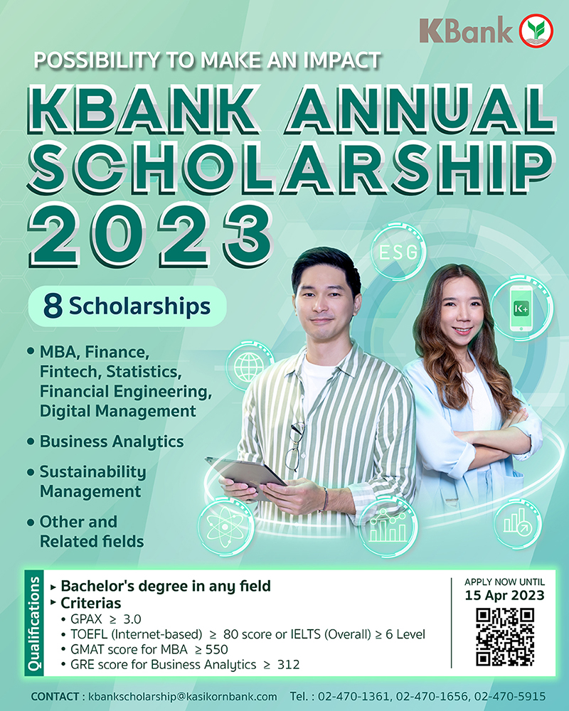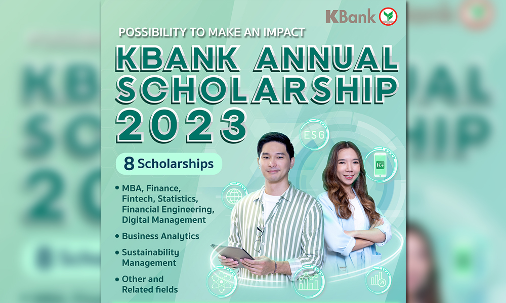 ทั้งนี้ เมื่อเดือนมกราคม 2566 ที่ผ่านมา ธนาคารกสิกรไทยได้เปิดโครงการ KBank Young Scholarship 2023 เปิดรับสมัครจำนวน 5 ทุน สำหรับนิสิต นักศึกษาที่กำลังศึกษาอยู่ชั้นปีที่ 4 และใกล้จะจบการศึกษา ได้เข้าศึกษาต่อในระดับปริญญาโท ในมหาวิทยาลัยระดับโลกพร้อมเปิดกว้างให้ทุกคนได้เลือกศึกษาต่อในสาขาวิชาที่สอดคล้องกับการขับเคลื่อนกลยุทธ์และธุรกิจของธนาคาร
