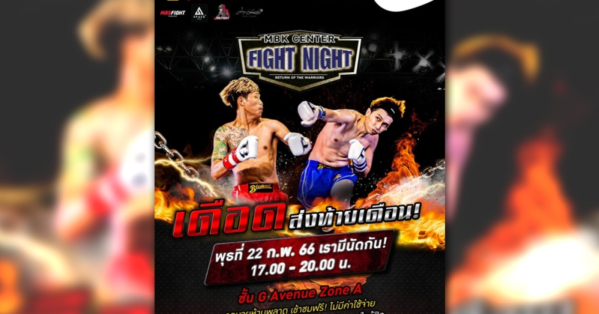 ศูนย์การค้าเอ็ม บี เค เซ็นเตอร์ ชวนชมชวนเชียร์มวยมันส์ MBK CENTER FIGHT NIGHT ทุกวันพุธแรกและวันพุธสุดท้ายของเดือน เปิดให้ประชาชนทั่วไปและลูกค้าทั้งคนไทยและต่างชาติเข้าชมฟรี นักมวยมากฝีมือทั้งนักชกคนไทยและต่างชาติ ทั้งชายและหญิง จำนวน 6 คู่ ปล่อยหมัดเด็ดฟาดแข้งสุดเดือดใจกลางกรุง โชว์ลีลาแม่ไม้มวยไทยและมวยสากล โดยในครั้งต่อไปจะจัดขึ้นในวันพุธที่ 22 กุมภาพันธ์ วันพุธที่ 1 และ วันพุธที่ 29 มีนาคม วันพุธที่ 5 และ วันพุธที่ 26 เมษายน วันพุธที่ 3 และ วันพุธที่ 31 พฤษภาคม วันพุธที่ 7 และ วันพุธที่ 28 มิถุนายน วันพุธที่ 5 และ วันพุธที่ 26 กรกฎาคม วันพุธที่ 2 และ วันพุธที่ 30 สิงหาคม วันพุธที่ 6 และ วันพุธที่ 27 กันยายน วันพุธที่ 4 และ วันพุธที่ 25 ตุลาคม วันพุธที่ 1 และ วันพุธที่ 29 พฤศจิกายน วันพุธที่ 6 และ วันพุธที่ 27 ธันวาคม 2566 บริเวณเวทีมวยชั่วคราว ลานกิจกรรมเอ็ม บี เค อเวนิว โซน A ตั้งแต่เวลา 17.00 น. – 20.00 น