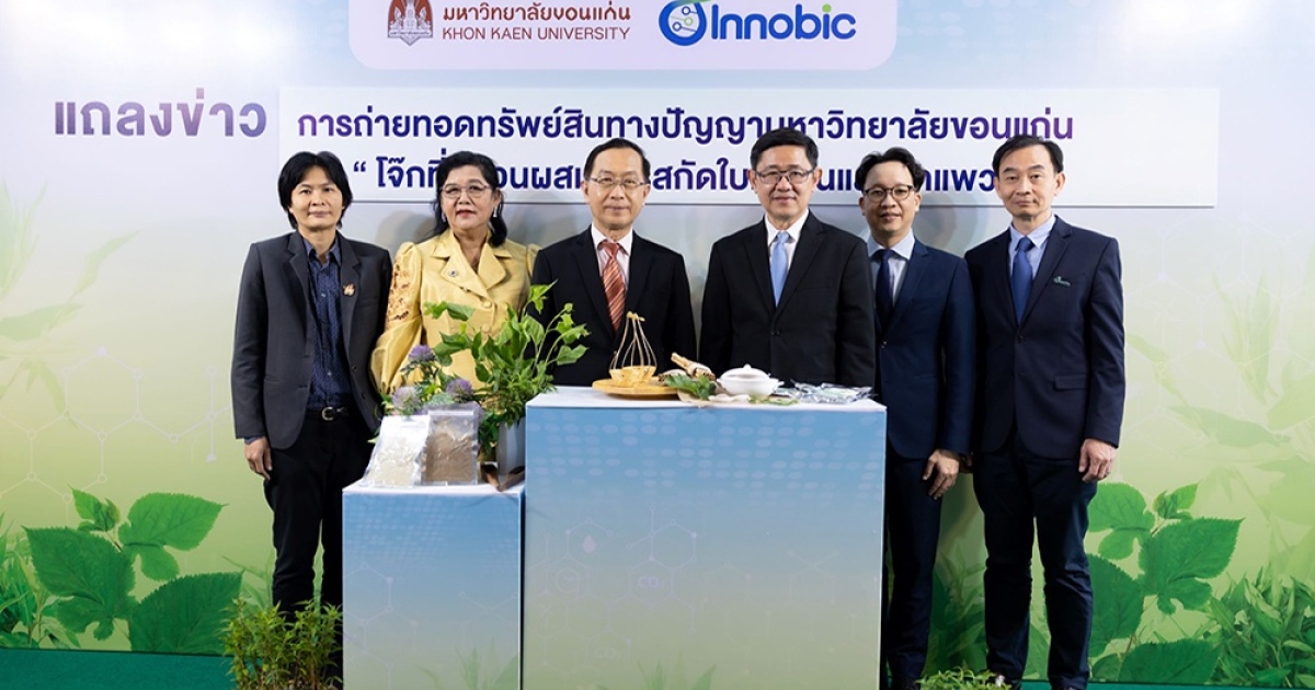 ดร.บุรณิน รัตนสมบัติ ประธานเจ้าหน้าที่ปฏิบัติการกลุ่มธุรกิจใหม่และโครงสร้างพื้นฐาน บริษัท ปตท. จำกัด (มหาชน) และประธานกรรมการ บริษัท อินโนบิก (เอเซีย) จำกัด (ที่ 3 จากขวา) พร้อมด้วย รศ. นพ. ชาญชัย พานทองวิริยะกุล อธิการบดีมหาวิทยาลัยขอนแก่น (ที่ 3 จากซ้าย) ศ.ดร.จินตนาภรณ์ วัฒนธร รักษาการแทนผู้อำนวยการสถาบันวิจัยเพื่อพัฒนาสมรรถนะมนุษย์และการเสริมสร้างสุขภาพ มหาวิทยาลัยขอนแก่น (ที่ 2 จากซ้าย) และ ดร.ณัฐ อธิวิทวัส กรรมการผู้จัดการใหญ่ บริษัท อินโนบิก (เอเซีย) จำกัด (ที่ 2 จากขวา) ร่วมงานแถลงข่าวพิธีลงนามการถ่ายทอดทรัพย์สินทางปัญญา “โจ๊กที่มีส่วนผสมสารสกัดใบหม่อนและผักแพว”