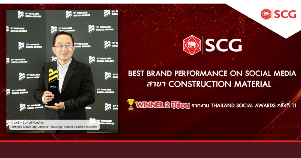 SCG Brand Official Platforms โดยนายเกริก ยิ้มพรพิพัฒน์ผล Portfolio Marketing Director จาก Housing Product Solution Business บริษัท เอสซีจี รูฟฟิ่ง จำกัด ขึ้นรับรางวัลชนะเลิศ 'BEST BRAND PERFORMANCE ON SOCIAL MEDIA สาขา CONSTRUCTION MATERIAL' โดยได้รับรางวัลต่อเนื่อง 2 ปีซ้อน จากงาน THAILAND SOCIAL AWARDS ครั้งที่ 11 งานประกาศรางวัลโซเชียลที่ยิ่งใหญ่ที่สุดของประเทศไทย จัดโดย บริษัท ไวซ์ไซท์ (ประเทศไทย) จำกัด โดยใช้เกณฑ์วัดผล เช่น จำนวนผู้ติดตาม, การมีปฏิสัมพันธ์ระหว่างแบรนด์กับลูกค้า และการพูดถึงแบรนด์บนโซเชียลมีเดีย รวมไปถึงสัดส่วนในการแสดงความคิดเห็นและการส่งต่อเนื้อหาของแบรนด์, กระแสตอบรับหรือความรู้สึกของลูกค้าที่มีต่อแบรนด์ และการเกิดความตั้งใจที่จะซื้อสินค้าจากแบรนด์ เป็นต้น