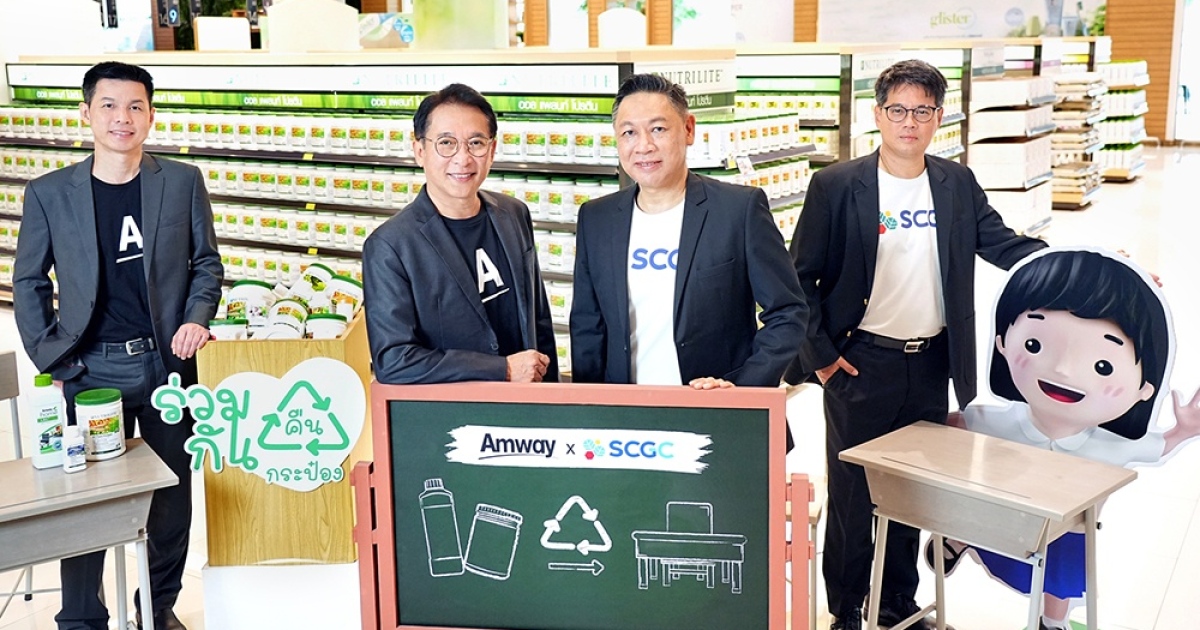 บริษัท แอมเวย์ (ประเทศไทย) จำกัด มุ่งมั่นสร้างสังคมเพื่อความยั่งยืน นำโดย นายกิจธวัช ฤทธีราวี กรรมผู้จัดการ (ที่ 2 จากซ้าย) และนายกมล เกี่ยวศรีกุล ผู้อำนวยการฝ่ายปฏิบัติการ (ที่ 1 จากซ้าย) จับมือกับ บริษัท เอสซีจี เคมิคอลส์ จำกัด (มหาชน) หรือ SCGC โดยมี นายพิสันติ์ เอื้อวิทยา New Business Director (ที่ 2 จากขวา) และนายกฤษดา เรืองโชติวิทย์ Head of ESG Office (ที่ 1 จากขวา) เปิดตัวกิจกรรม 'ร่วมกันคืนกระป๋อง' โดยจะอัปไซเคิลบรรจุภัณฑ์แอมเวย์ใช้แล้วที่ทำจากพลาสติกชนิด HDPE ให้กลายเป็น 'โต๊ะ-เก้าอี้นักเรียน' เพื่อมอบให้แก่โรงเรียนตำรวจตระเวนชายแดนในพื้นที่ห่างไกล ตั้งเป้าจำนวน 200 ชุด ซึ่งนอกจากจะเป็นการหมุนเวียนใช้ทรัพยากรให้เกิดประโยชน์แล้ว ยังสร้างการเรียนรู้ให้เยาวชนได้เข้าใจถึงการนำทรัพยากรมาใช้ให้เกิดประโยชน์สูงสุดตามหลักเศรษฐกิจหมุนเวียนอีกทางหนึ่งด้วย