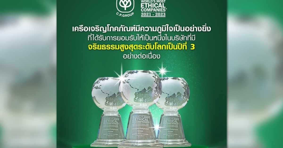 Ethisphere สถาบันชั้นนำระดับโลกด้านการวัดและประเมินมาตรฐานจริยธรรมในการดำเนินธุรกิจ ได้ประกาศผลการพิจารณาบริษัทที่มีจริยธรรมมากที่สุดในโลกประจำปี 2566 (The 2023 World’s Most Ethical Companies) โดยเครือเจริญโภคภัณฑ์ หรือ เครือซีพี ภาคธุรกิจจากประเทศไทยได้รับการพิจารณาติด 1 ใน 135 องค์กรของ 49 กลุ่มอุตสาหกรรม จาก 19 ประเทศที่ได้รับการคัดเลือกให้เป็น “บริษัทที่ดำเนินธุรกิจอย่างมีจริยธรรมมากที่สุดในโลก ประจำปี 2566” ต่อเนื่องเป็นปีที่ 3 ในกลุ่มอุตสาหกรรมอาหารและเครื่องดื่มร่วมกับ 7 บริษัทชั้นนำประกอบด้วย Archer Daniels Midland Company, Brown-Forman Corporation ,Grupo Bimbo, illycaffè, Kellogg Company, PepsiCo Inc. และ The Hershey Company ความสำเร็จดังกล่าวสะท้อนถึงการได้รับการยอมรับและความไว้วางใจจากผู้มีส่วนได้เสียในระดับสากลต่อการเป็นบริษัทที่มีความมุ่งมั่นในการดำเนินธุรกิจด้วยหลักจริยธรรมและความรับผิดชอบพร้อมสร้างคุณค่าเชิงบวกในทุกมิติอย่างครอบคลุมและต่อเนื่อง