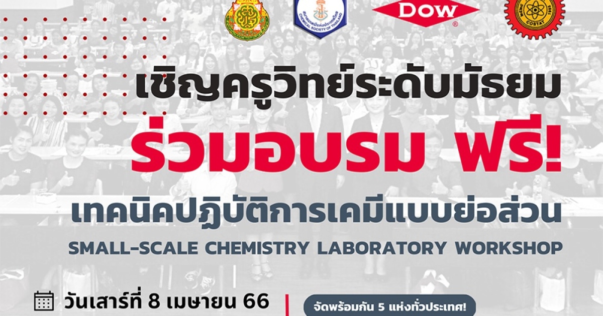 กลุ่มบริษัท ดาว ประเทศไทย (Dow) ร่วมกับสมาคมเคมีแห่งประเทศไทยฯ สำนักงานคณะกรรมการการศึกษาขั้นพื้นฐาน (สพฐ.) ต่อยอดความร่วมมือจากโครงการห้องเรียนเคมีดาว กับสภาสมาคมวิทยาศาสตร์และเทคโนโลยีแห่งประเทศไทย (สสวทท) จัดเวิร์คช้อป “การอบรมเทคนิคปฏิบัติการเคมีแบบย่อส่วน (small-scale chemistry laboratory) ภายใต้โครงการขยายเครือข่ายครูวิทยาศาสตร์ด้านปฏิบัติการเคมีแบบย่อส่วน โดยไม่เสียค่าใช้จ่ายให้กับคุณครูวิทยาศาสตร์ระดับมัธยมศึกษา ในวันเสาร์ที่ 8 เมษายน 2566 เวลา 8.30 – 16.00 น. พร้อมกัน 5 แห่งทั่วทุกภาคของประเทศ (รับเพียง 30 ท่าน/แห่ง) ได้แก่ 1) โรงเรียนเชียงคาน จ.เลย (ภาคตะวันออกเฉียงเหนือตอนบน) 2) โรงเรียนบุณฑริกวิทยาคาร จ.อุบลราชธานี (ภาคตะวันออกเฉียงเหนือตอนล่าง) 3) โรงเรียนดัดดรุณี จ.ฉะเชิงเทรา (ภาคตะวันออก) 4) โรงเรียนสตรีศรีน่าน จ.น่าน (ภาคเหนือ) และ 5) โรงเรียนภูเก็ตวิทยาลัย จ.ภูเก็ต (ภาคใต้)