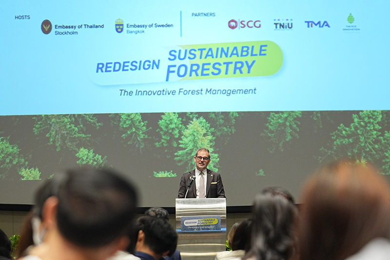 นายยอน ออสเตริม เกรินดาห์ล เอกอัครราชทูตสวีเดนประจำประเทศไทย กล่าวว่า “ปัจจัยสำคัญที่ทำให้สวีเดนส่งออกไม้เป็นอันดับที่ 3 ของโลก มูลค่ารวมกว่า 15 พันล้านดอลลาร์สหรัฐต่อปี แต่ยังสามารถเพิ่มพื้นที่สีเขียวที่เคยเหลือเพียง 25% เมื่อ 100 ปีก่อน เป็น 75% คือการใช้พระราชบัญญัติป่าไม้ (Forestry Act) ที่ทำให้ตัดไม้แต่ได้ป่า ถ้าตัดต้นไม้หนึ่งต้น ต้องปลูกเพิ่มอย่างน้อยสามต้น นอกจากจะได้พื้นที่ป่าเพิ่มขึ้น ระบบนิเวศที่สมบูรณ์ ช่วยดูดซับคาร์บอน ลดผลกระทบด้านการเปลี่ยนแปลงสภาพภูมิอากาศแล้ว ยังช่วยให้คนอยู่ร่วมกับป่าใช้ประโยชน์จากป่า และมีส่วนร่วมในการฟื้นฟูป่าไปพร้อมกัน โดยได้ป่าไม้ที่มีความสำคัญต่อเศรษฐกิจ ช่วยสร้างงาน สร้างรายได้ให้ประชาชน เช่น ไม้สำหรับการก่อสร้างอาคารสมัยใหม่ ไม้แปรรูปเป็นเฟอร์นิเจอร์ รวมถึงเศษไม้เหลือใช้เป็นเชื้อเพลิงชีวมวล รัฐบาลสวีเดนหวังว่าโมเดลและประสบการณ์ที่นำมาแบ่งปันในวันนี้ จะเกิดความร่วมมือระหว่างสองประเทศเพื่อขยายแนวคิดแห่งความยั่งยืนนี้ต่อไป”