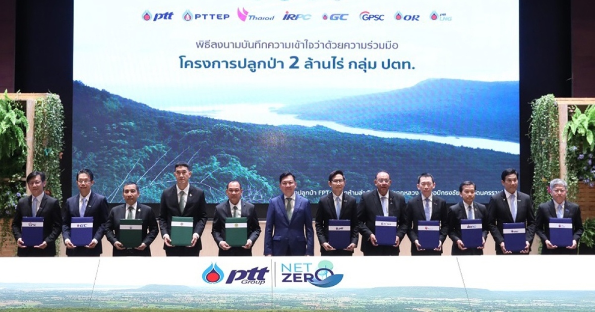 นายอรรถพล ฤกษ์พิบูลย์ ประธานเจ้าหน้าที่บริหารและกรรมการผู้จัดการใหญ่ บริษัท ปตท. จำกัด (มหาชน) กล่าวว่า ปตท. พร้อมบริษัทในกลุ่ม ประกอบด้วย บริษัท ปตท.สำรวจและผลิตปิโตรเลียม จำกัด (มหาชน) บริษัท ไทยออยล์ จำกัด (มหาชน) บริษัท ไออาร์พีซี จำกัด (มหาชน) บริษัท พีทีที โกลบอล เคมิคอล จำกัด (มหาชน) บริษัท โกลบอล เพาเวอร์ ซินเนอร์ยี่ จำกัด (มหาชน) บริษัท ปตท. น้ำมันและค้าปลีก จำกัด (มหาชน) และ บริษัท พีทีที แอลเอ็นจี จำกัด ได้ลงนาม MOU จำนวน 3 ฉบับ ได้แก่ โครงการพัฒนาพื้นที่ปลูก บำรุงรักษา และระบบนิเวศป่าไม้ กับ กรมป่าไม้ โครงการพัฒนาพื้นที่ปลูก บำรุงรักษา และระบบนิเวศป่าไม้ กับ กรมอุทยานแห่งชาติ สัตว์ป่า และพันธุ์พืช และโครงการปลูกและบำรุงรักษาป่าชายเลน เพื่อประโยชน์จากคาร์บอนเครดิต กับ กรมทรัพยากรทางทะเลและชายฝั่ง ซึ่งเป็นการผนึกกำลังของภาคีภาครัฐและเอกชนทั้งในภาคทฤษฎีและภาคปฏิบัติ เช่น การสนับสนุนงานวิจัยและแบ่งปันข้อมูลเชิงวิชาการ การปลูกป่าใหม่และฟื้นฟูบำรุงป่าเก่า ป่าอนุรักษ์ ป่าสงวนแห่งชาติ อุทยานแห่งชาติ เขตรักษาพันธุ์สัตว์ป่า ป่าชุมชน และป่าชายเลน เพื่อเพิ่มพื้นที่ดูดซับก๊าซคาร์บอนไดออกไซด์และแหล่งกักเก็บคาร์บอน จำนวน 2 ล้านไร่ ตลอดจนส่งเสริมการมีส่วนร่วมของชุมชนท้องถิ่นในการอนุรักษ์ทรัพยากรป่าไม้ สัตว์ป่า ความหลากหลายทางชีวภาพ รวมไปถึงสนับสนุนการบรรลุเป้าหมายความเป็นกลางทางคาร์บอน (Carbon Neutrality) ในปี 2050 และการปล่อยก๊าซเรือนกระจกสุทธิเป็นศูนย์ (Net Zero Emissions) ในปี 2065 ตามที่ประเทศได้กำหนดไว้