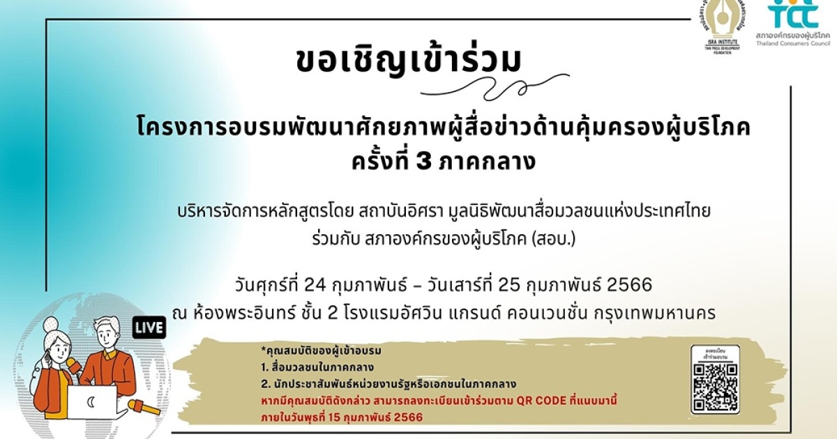 ขอเชิญเข้าร่วมโครงการอบรมพัฒนาศักยภาพผู้สื่อข่าวด้านคุ้มครองผู้บริโภค ครั้งที่ 3 ภาคกลาง ในวันศุกร์ที่ 24 กุมภาพันธ์ – วันเสาร์ที่ 25 กุมภาพันธ์ 2566 ณ ห้องพระอินทร์ ชั้น 2 โรงแรมอัศวิน แกรนด์ คอนเวนชั่น กรุงเทพมหานคร โดยมีคุณสมบัติ ดังนี้