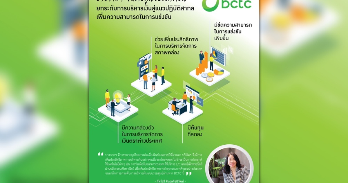 นางสาวภัทร์ภูรี ชินกุลกิจนิวัฒน์ รองกรรมการผู้จัดการใหญ่ กลุ่มงานบัญชีและการเงิน บริษัท บางจาก คอร์ปอเรชั่น จำกัด (มหาชน) กล่าวว่า ในฐานะผู้นำการเปลี่ยนผ่านด้านพลังงาน บางจากฯ มีการขยายธุรกิจอย่างต่อเนื่องในช่วงหลายปีที่ผ่านมา ทั้งจากการต่อยอดธุรกิจปัจจุบัน และจากการขยายการลงทุนไปสู่พลังงานแห่งอนาคต ดังนั้น เพื่อรองรับการขยายตัวของธุรกิจ บริษัทฯ จึงมีการเพิ่มประสิทธิภาพการบริหารเงินอย่างต่อเนื่องมาโดยตลอด ไม่ว่าจะเป็นการประยุกต์ใช้เทคโนโลยีต่าง ๆ เช่น การร่วมมือกับธนาคารกรุงเทพ ใช้บริการ L/C แบบอิเล็กทรอนิกส์ผ่านบล็อกเชนเชิงพาณิชย์ เพื่อเพิ่มประสิทธิภาพการทำธุรกรรมการค้าระหว่างประเทศ จนมาถึงการยกระดับการบริหารเงินแบบรวมศูนย์ผ่านทาง BCTC นี้ ซึ่งจะช่วยเพิ่มประสิทธิภาพในการบริหารจัดการสภาพคล่อง และเพิ่มประสิทธิภาพในการบริหารจัดการเงินตราต่างประเทศของกลุ่มบริษัทฯ ตลอดจนได้รับสิทธิประโยชน์ทางภาษีเพิ่มเติม ทำให้กลุ่มบริษัทฯ มีต้นทุนที่ลดลง มีความคล่องตัวในการบริหารจัดการเงินตราต่างประเทศ ส่งผลให้กลุ่มบริษัทฯ มีขีดความสามารถในการแข่งขันเพิ่มขึ้น สอดคล้องกับนโยบาย ยุทธศาสตร์ และการพัฒนาธุรกิจเพื่อเพิ่มมูลค่ากิจการและสร้างความเติบโตอย่างต่อเนื่องของบางจากฯ