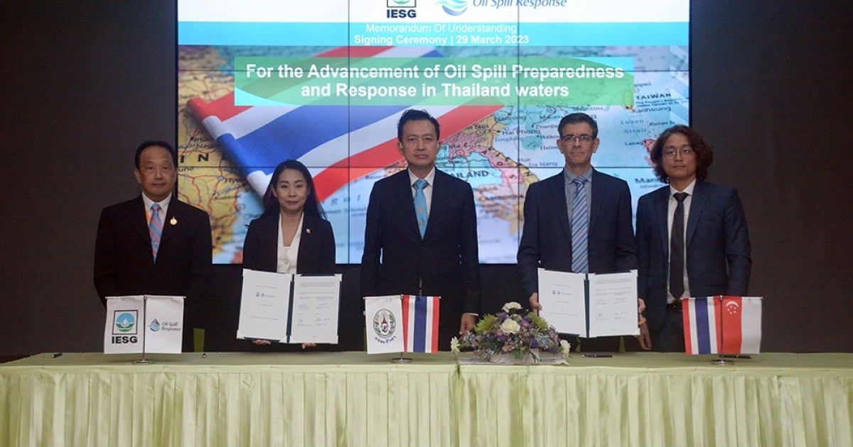 นางกัณฑมาศ กฤตยานุกูล รักษาการผู้ช่วยกรรมการผู้จัดการใหญ่ สายงานการผลิตและจัดส่งน้ำมัน บริษัท บางจาก คอร์ปอเรชั่น จำกัด (มหาชน) ในฐานะนายกสมาคมอนุรักษ์สภาพแวดล้อมของกลุ่มอุตสาหกรรมน้ำมัน (Oil Industry Environmental Safety Group -IESG) และ นาย Darren Waterman ผู้อำนวยการประจำภูมิภาคเอเชียแปซิฟิก บริษัท Oil Spill Response Limited จำกัด (OSRL) ลงนามในบันทึกข้อตกลงความร่วมมือระหว่าง สมาคมอนุรักษ์สภาพแวดล้อมของกลุ่มอุตสาหกรรมน้ำมัน (IESG) และ Oil Spill Response Limited (OSRL) ผู้เชี่ยวชาญด้านเทคโนโลยีและอุปกรณ์เกี่ยวกับการรับมือเหตุฉุกเฉินกรณีน้ำมันรั่วไหลจากประเทศสิงคโปร์ เพื่อร่วมกันยกระดับการดำเนินการป้องกันและแก้ไขกรณีเกิดการรั่วไหลของน้ำมันในประเทศไทย ผ่านความร่วมมือในการให้ความรู้ด้านเทคโนโลยีเกี่ยวกับการรับมือเหตุฉุกเฉินกรณีน้ำมันรั่วไหล สนับสนุนอุปกรณ์และบุคลากรระหว่าง OSRL กับสมาชิกของ IESG ในประเทศไทย ตลอดจนแลกเปลี่ยนความรู้และประสบการณ์ โดยมี นายภูริพัฒน์ ธีระกุลพิศุทธิ์ รองอธิบดีกรมเจ้าท่า ให้เกียรติร่วมในพิธีลงนามฯ และแสดงความยินดีกับความร่วมมือในการบริหารจัดการด้านความปลอดภัยและสิ่งแวดล้อม และการกระชับความสัมพันธ์ในกลุ่มอุตสาหกรรม Oil & Gas ระหว่างประเทศ พร้อมด้วยนายปิติ ศรีสุขสมบัติ ผู้แทนคณะกรรมการบริหารสมาคมอนุรักษ์สภาพแวดล้อมของกลุ่มอุตสาหกรรมน้ำมัน (IESG) ร่วมเป็นสักขีพยานและกล่าวถึงความเป็นมาของบันทึกข้อตกลงในครั้งนี้