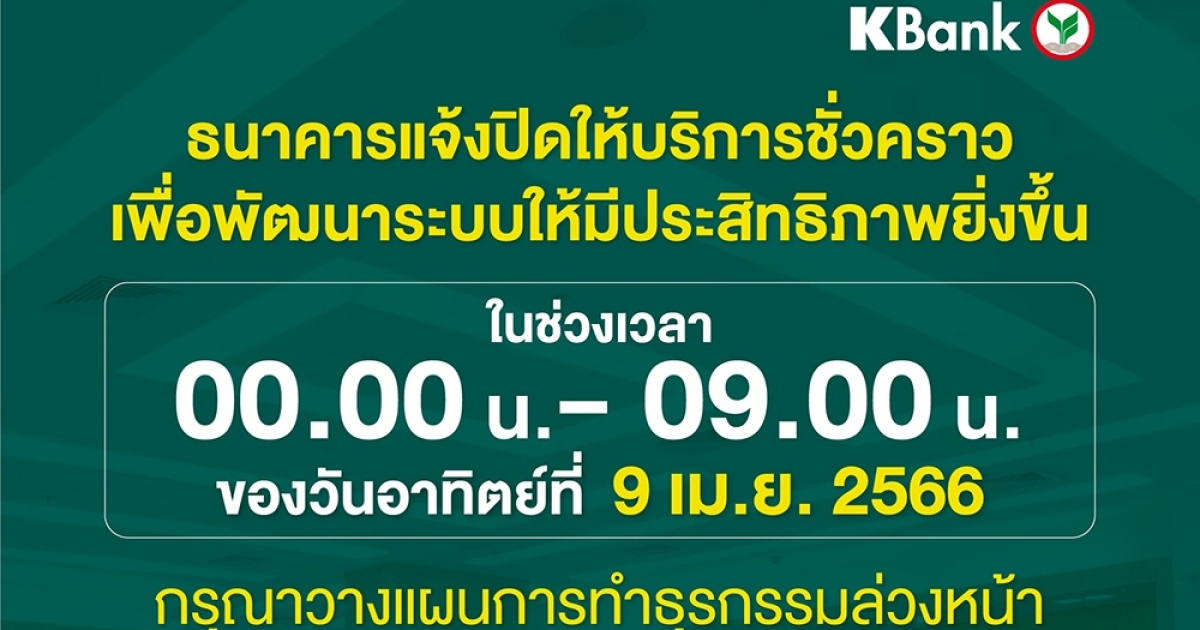 ธนาคารกสิกรไทยแจ้งจะปิดให้บริการชั่วคราว เพื่อพัฒนาระบบให้มีประสิทธิภาพยิ่งขึ้น ในวันอาทิตย์ที่ 9 เมษายน 2566 ช่วง เวลา 00:00 - 09:00 น. ส่งผลให้ลูกค้าไม่สามารถทำธุรกรรม ดังนี้
