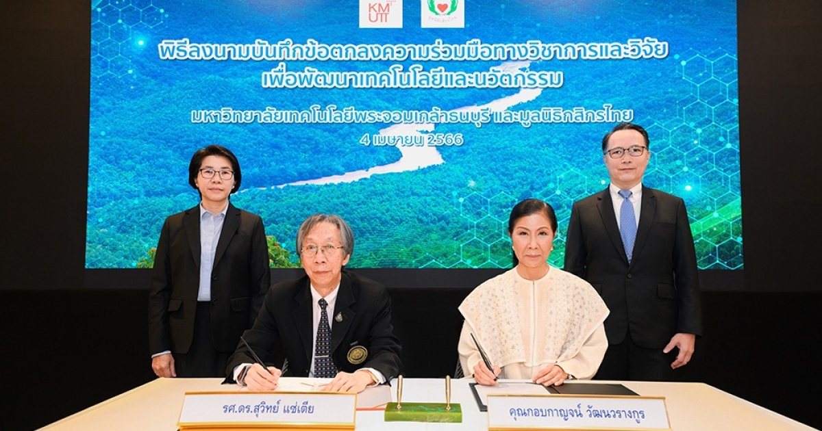 นางกอบกาญจน์ วัฒนวรางกูร (ที่ 2 จากขวา) ประธานมูลนิธิกสิกรไทย และ รศ.ดร.สุวิทย์ แซ่เตีย (ที่ 2 จากซ้าย) อธิการบดีมหาวิทยาลัยเทคโนโลยีพระจอมเกล้าธนบุรี ร่วมลงนามบันทึกข้อตกลงความร่วมมือในการพัฒนาเทคโนโลยีและนวัตกรรมด้านการแปรรูป สกัดและผลิตสารสำคัญออกฤทธิ์ทางยาจากธรรมชาติ ซึ่งเป็นช่วงกลางน้ำของห่วงโซ่การพัฒนายาจากพืชยาใต้ป่าภายใต้โครงการน่านแซนด์บอกซ์ โดยพันธกิจครั้งนี้มุ่งเน้นการเพิ่มประสิทธิภาพและประสิทธิผลตลอดจนสร้างมาตรฐานใหม่ของการผลิตจากพืชยาสู่สารสกัดสำคัญออกฤทธิ์ทางยามาตรฐานสูงระดับสากล เป็นการยกระดับคุณค่าและมูลค่าเพื่อสร้างรายได้ให้เกษตรกรควบคู่ไปกับการฟื้นคืนป่าต้นน้ำน่าน อันเป็นทรัพยากรที่มีค่าเป็นป่าต้นน้ำอันดับ 1 ของประเทศ โดยมี ดร.อดิศวร์ หลายชูไทย (ขวา) กรรมการและผู้จัดการมูลนิธิกสิกรไทย และ ดร.กัญญวิมว์ กีรติกร (ซ้าย) รักษาการแทนรองอธิการบดีอาวุโสฝ่ายวิจัยและนวัตกรรม มหาวิทยาลัยเทคโนโลยีพระจอมเกล้าธนบุรี ร่วมเป็นสักขีพยาน ณ ธนาคารกสิกรไทย อาคารราษฎร์บูรณะ เมื่อเร็วๆ นี้