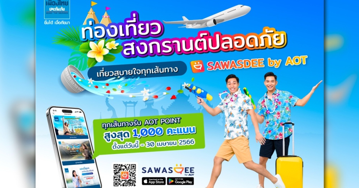 'SAWASDEE by AOT' ย้ำจุดยืน Must Have Thailand Travel App จับมือ 'เมืองไทยประกันภัย' เสริมแกร่งด้าน Digital Travel Safety จัดแคมเปญใหม่ฉลองสงกรานต์ ชวนซื้อประกันเดินทาง-อุบัติเหตุผ่านแอปพลิเคชัน เบี้ยเริ่มต้นเพียง 48 บาท สมัครง่าย ภายใน 3 นาที สำหรับประกันเดินทางต่างประเทศซื้อล่วงหน้าได้ทันใจแค่ 2 ชม. คุ้มครองทันทีทุกที่ทั่วไทยไปไกลถึงทั่วโลก พร้อมรับทันที AOT Points สูงสุด 1,000 คะแนน วันนี้-30 เม.ย. เท่านั้น