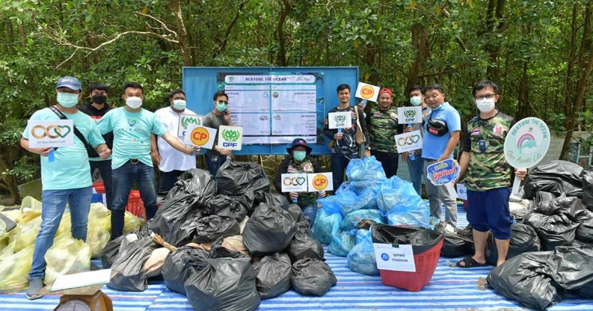ซีพีเอฟมุ่งมั่นจัดการปัญหาขยะทะเลและปกป้องมหาสมุทร ภายใต้ โครงการ Restore the Ocean ร่วมพิทักษ์ทะเลโลก ซึ่งเป็นต้นทางของความมั่นคงทางอาหาร ผ่านการดำเนินกิจกรรมต่างๆ และมีการจัดการข้อมูลขยะอย่างเป็นระบบ เริ่มตั้งแต่การจัดกิจกรรม 'ขยะชายหาด' สร้างการมีส่วนร่วม และปลูกจิตสำนึกให้กับพนักงานของบริษัท ร่วมกับชุมชนทำความสะอาดชายหาดในบริเวณใกล้เคียงสถานประกอบการของซีพีเอฟอย่างสม่ำเสมอ และได้มีการต่อยอดกิจกรรมไปยังชุมชนใกล้เคียง เช่น กิจกรรม 'กับดักขยะทะเล' ที่ได้ร่วมกับชุมชนบริเวณปากแม่น้ำลำคลอง เก็บและคัดแยกขยะจากป่าชายเลน นำมาแปรรูปเป็นผลิตภัณฑ์ชุมชน อาทิ กระถางต้นไม้
