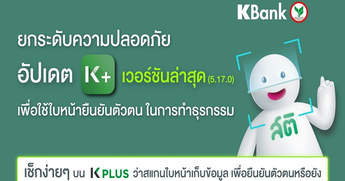 กสิกรไทยยกระดับความปลอดภัย แจ้งลูกค้า K PLUS อัปเดตเวอร์ชันล่าสุด เพื่อใช้ใบหน้ายืนยันตัวตนในการทำธุรกรรม
