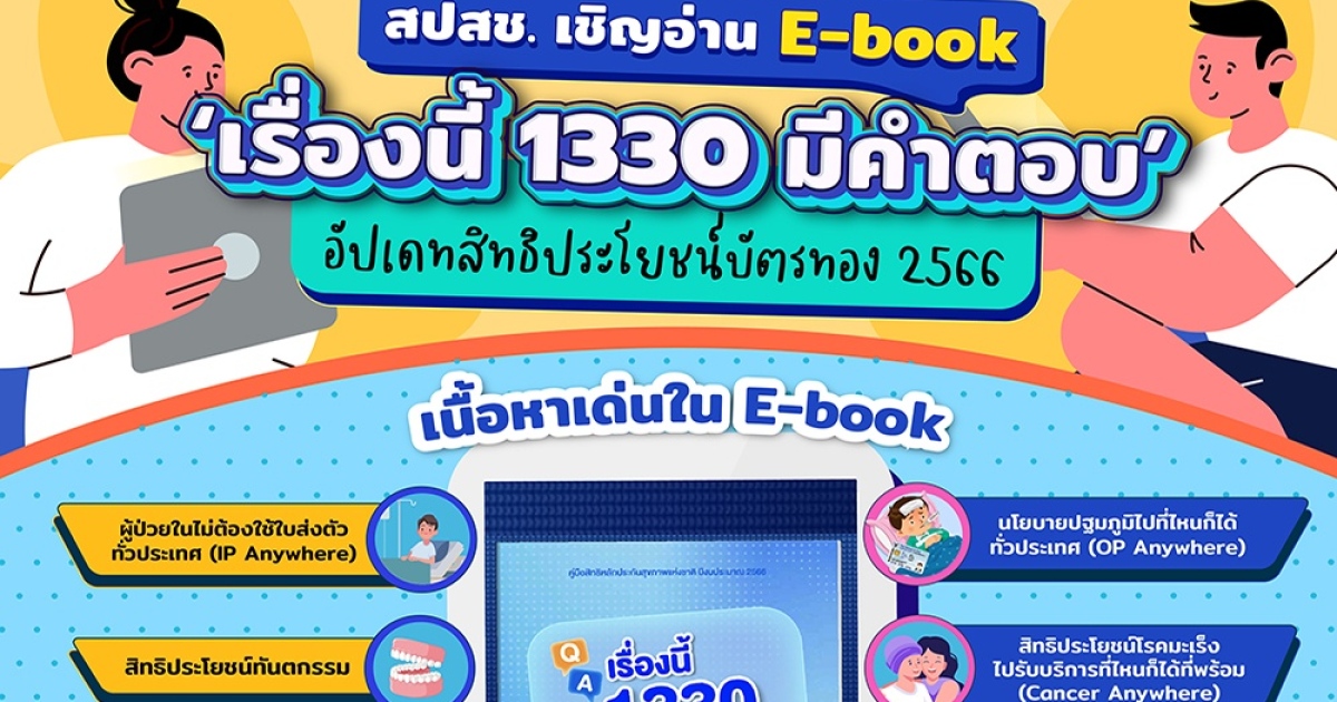 ทั้งนี้เนื้อหาใน e-Book เรื่องนี้ 1330 มีคำตอบ จะประกอบด้วย 12 หัวข้อ ที่ประชาชนมักสอบถามเข้ามาบ่อยๆ ประกอบด้วย 1. นโยบายปฐมภูมิไปที่ไหนก็ได้ทั่วประเทศ (OP Anywhere) 2. ผู้ป่วยในไม่ต้องใช้ใบส่งตัวทั่วประเทศ (IP Anywhere) 3. สิทธิประโยชน์โรคมะเร็งไปรับบริการที่ไหนก็ได้ที่พร้อม (Cancer Anywhere) 4. สิทธิประโยชน์ทันตกรรม 5. สิทธิประโยชน์เกี่ยวกับโรคไต 6. สิทธิประโยชน์ผู้ติดเชื้อเอชไอวีและผู้ป่วยเอดส์ 7. สิทธิประโยชน์การฝากครรภ์และคลอดบุตร 8. สิทธิประโยชน์ยา เวชภัณฑ์ อวัยวะเทียม และอุปกรณ์ทางการแพทย์ 9. สิทธิประโยชน์กรณีอุบัติเหตุ เจ็บป่วยฉุกเฉิน 10. การใช้สิทธิสำหรับประชาชนที่ยังไม่ได้ลงทะเบียนเลือกสถานพยาบาลประจำตัว (สิทธิว่าง) 11. ช่องทางการตรวจสอบสิทธิ และ 12. ช่องทางแจ้งเรื่องร้องเรียน ร้องทุกข์