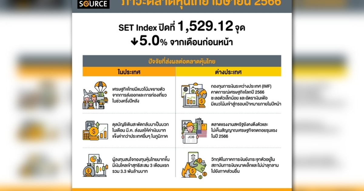 - ณ สิ้นเดือนเมษายน 2566 SET Index ปิดที่ 1,529.12 จุด ปรับลดลง 5.0% จากเดือนก่อนหน้า และปรับลดลง 8.4% เมื่อเทียบกับสิ้นปีก่อนหน้า โดยปรับไปในทิศทางเดียวกับดัชนีตลาดหลักทรัพย์อื่นใน ASEAN