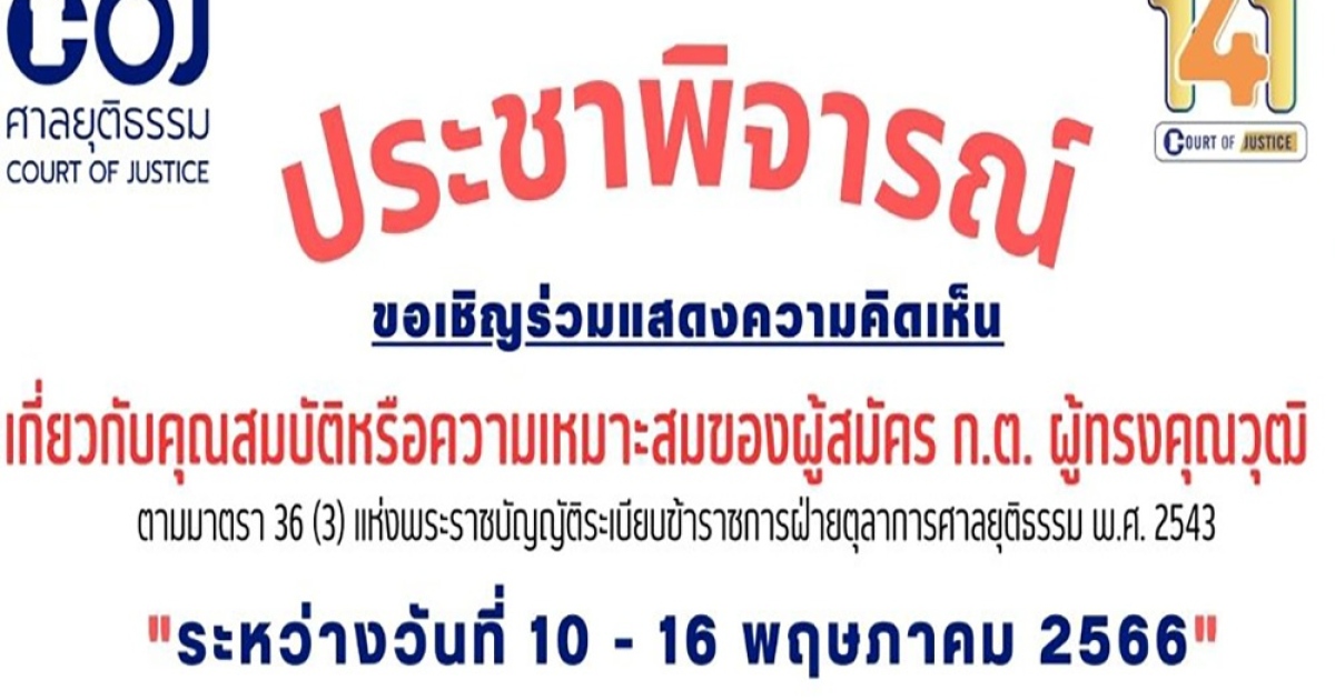 ศาลยุติธรรมเชิญชวนประชาชน ร่วมแสดงข้อคิดเห็น-ข้อมูล ตรวจคุณสมบัติผู้สมัคร 9 ราย เลือกซ่อม ก.ต.ผู้ทรงคุณวุฒิสัดส่วนคนนอก พร้อมรับข้อมูลทุกช่องทางไปรษณีย์ แฟกซ์ อีเมล จนถึง 16 พ.ค.นี้