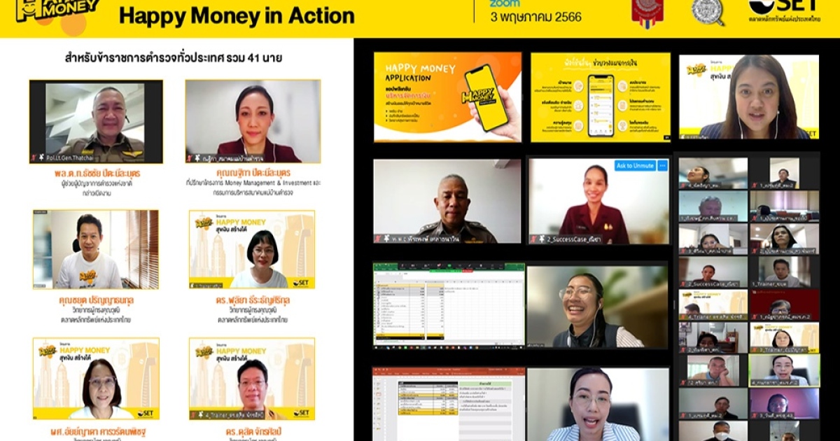 ตลาดหลักทรัพย์แห่งประเทศไทย ร่วมกับ สำนักงานตำรวจแห่งชาติ และสมาคมแม่บ้านตำรวจ เดินหน้าส่งเสริมความรู้ทางการเงินต่อเนื่อง จัดเวิร์กช็อปออนไลน์ 'Happy Money in Action' เส้นทางสร้างสุขทางการเงิน โดยมี พล.ต.ท. ธัชชัย ปิตะนีละบุตร ผู้ช่วยผู้บัญชาการตำรวจแห่งชาติ และณฐิกา ปิตะนีละบุตร ที่ปรึกษาโครงการ Money Management & Investment และกรรมการบริหารสมาคมแม่บ้านตำรวจ พร้อมด้วยทีมวิทยากรตลาดหลักทรัพย์ฯ ร่วมเปิดการอบรมเมื่อ 3 พ.ค. ที่ผ่านมา ข้าราชการตำรวจเข้าร่วม 41 นาย ได้ฝึกวิเคราะห์และเก็บข้อมูลทางการเงินของตนเองผ่านแอปพลิเคชัน “Happy Money” เพื่อนำส่งผลปฏิบัติและรับคำแนะนำจากวิทยากร
