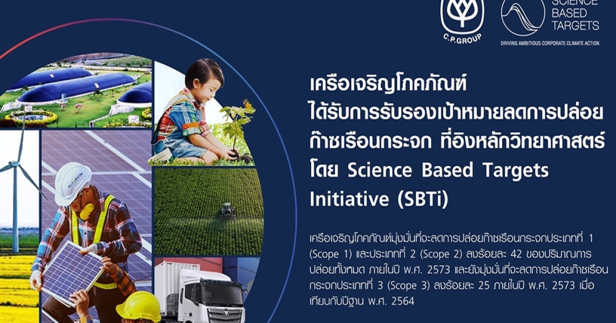 SBTi ประกาศรับรองเครือซีพีตั้งเป้าหมายลดการปล่อยก๊าซเรือนกระจกระยะสั้นภายในปี พ.ศ. 2573 อิงหลักวิทยาศาสตร์ตรงตามมาตรฐานสากล ตอกย้ำความมุ่งมั่นสู่องค์กร Net Zero Emissions