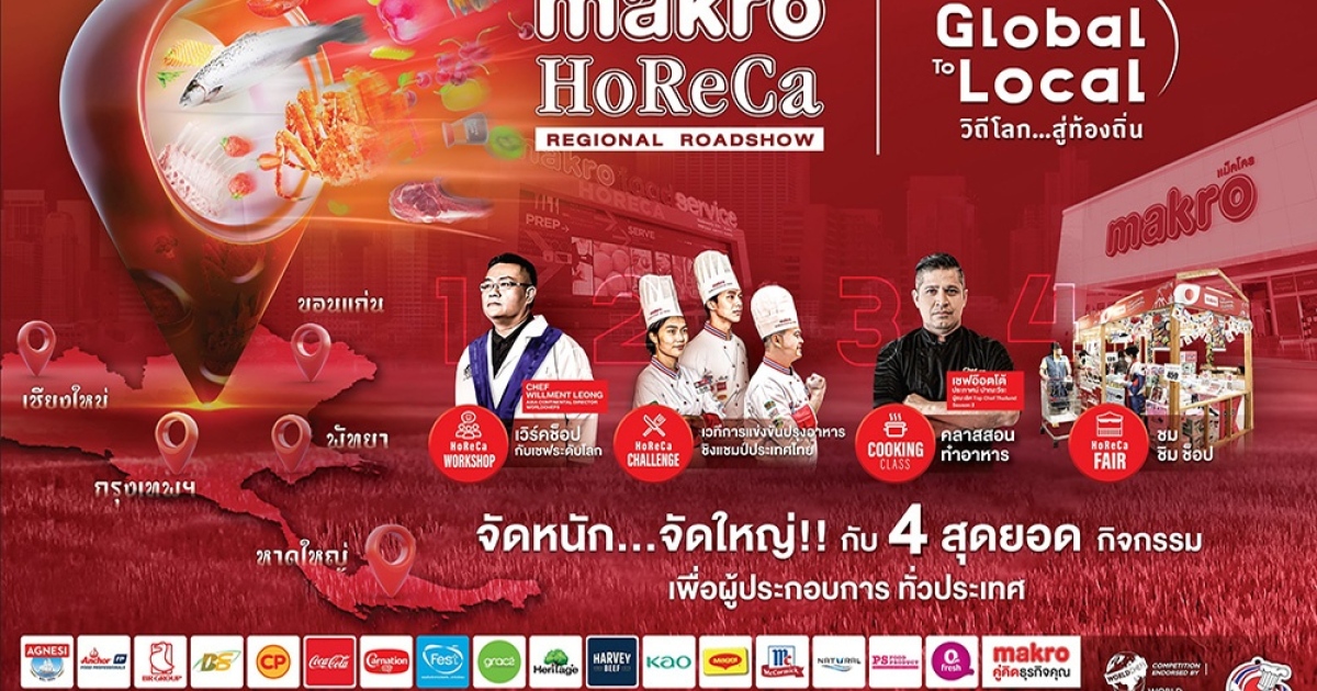 แม็คโคร เดินหน้าลุยจัดงาน เสริมแกร่งสร้างองค์ความรู้ให้แก่ผู้ประกอบการธุรกิจร้านอาหาร กับงาน “แม็คโคร โฮเรก้า ภูมิภาค โรดโชว์” ภายใต้คอนเซ็ปต์ “Global To Local วิถีโลก...สู่ท้องถิ่น” จัดหนัก จัดใหญ่ กับ 4 สุดยอดกิจกรรมเพื่อผู้ประกอบการ 5 ภูมิภาคทั่วประเทศ ได้แก่ 1.World Chef Workshop ชมเวิร์คช็อปกับเชฟระดับโลก เชฟวิลแมน ลีออง ที่จะมาเวิร์คช็อป เสริมองค์ความรู้แบบวิถีคนครัวระดับโลกสู่เสริมแกร่งให้แก่ผู้ประกอบการร้านอาหารทั่วประเทศ 2.PRO-CHEF Cooking Class เรียนรู้การทำอาหารจากเชฟชื่อดัง เชฟอ๊อตโต้ ประภาศน์ ปาณะวีระ ที่จะมาสอนทำอาหารเมนูสุดปัง เพื่อนำไปต่อยอดธุรกิจอาหารได้แบบง่ายๆ 3.Makro HoReCa Challenge 2023 ร่วมเป็นกำลังใจผู้เข้าแข่งขันกับเวทีการแข่งขันที่เฟ้นหาตัวแทนสุดยอดเชฟจากทุกภูมิภาค สู่การแข่งขันในระดับประเทศ พร้อมเป็นตัวแทนประเทศไทยไปแข่งขันเวทีระดับนานาชาติ ทั้งรุ่นเยาวชน และรุ่นมืออาชีพ กับการแข่งขันที่ผู้เข้าแข่งขันจะได้ลุ้นไปกับวัตถุดิบปริศนา (Makro Mystery Box) ภายใต้คอนเซ็ปต์ “Global To Local วิถีโลก...สู่ท้องถิ่น” สรรค์สร้างเมนูจากวัตถุดิบ แนวคิด และเทรนด์อาหาร Global สู่ Local ที่นำเอาเอกลักษณ์ของไทยมาผสมผสานกันได้อย่างลงตัว และ 4.Makro HoReCa Fair ร่วม ชม ชิม ช็อป วัตถุดิบอาหารจากทั่วโลกมากกว่า 300 รายการ