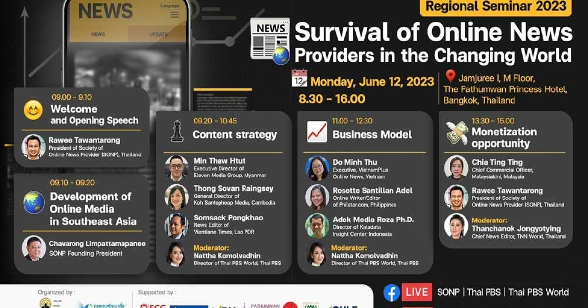 บรรณาธิการและผู้บริหารจากหลากสื่อดังบนออนไลน์ในเอเชียตะวันออกเฉียงใต้จะมาถกกันในหัวข้อ “ความอยู่รอดของสื่อออนไลน์ท่ามกลางความเปลี่ยนแปลง” ในงานสัมมนาระดับภูมิภาคในวันที่ 12 มิถุนายนนี้ จัดโดย สมาคมผู้ผลิตข่าวออนไลน์ ร่วมกับ กองทุนพัฒนาสื่อปลอดภัยและสร้างสรรค์