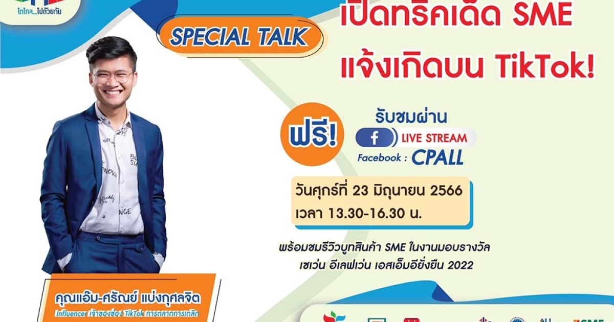 พร้อมเชิญร่วมอัพเดทเทคนิคการทำตลาดผ่านช่องทาง TikTok ในหัวข้อ 'เปิดทริคเด็ด SME แจ้งเกิดบน TikTok' กับ Influencer ชื่อดัง แอ๊ม-ศรัณย์ แบ่งกุศลจิต เจ้าของช่อง TikTok การตลาดการเตลิด ที่จะมาแชร์กลยุทธ์และเทคนิคแบบหมดเปลือก ผ่านช่องทาง Facebook Live CPALL ในวันศุกร์ที่ 23 มิถุนายน 2566 เวลา 13.30-16.30 น.