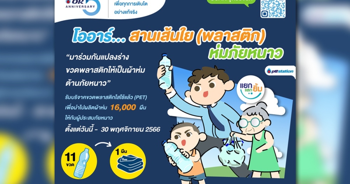 นายดิษทัต ปันยารชุน ประธานเจ้าหน้าที่บริหาร บริษัท ปตท. น้ำมันและการค้าปลีก จำกัด (มหาชน) หรือ OR เปิดเผยว่า OR จัดโครงการ 'โออาร์ สานเส้นใย (พลาสติก) ห่มภัยหนาว' เชิญชวนผู้บริโภคร่วมบริจาคขวดน้ำพลาสติก (PET) หรือขวดพลาสติกใสใช้แล้ว มาผลิตเป็นผ้าห่มเพื่อบริจาคให้ผู้ประสบภัยหนาวในภาคเหนือและภาคอีสาน โดยได้ร่วมมือกับโรงงานในเครือบริษัท พีทีที โกลบอล เคมิคอล จำกัด (GC) นำไปแปรรูปเป็นเส้นใยพลาสติก ก่อนเข้าสู่กระบวนการทอเป็นผืนผ้าห่มโดยกลุ่มวิสาหกิจชุมชนวัดจากแดง อ.พระประแดง จ.สมุทรปราการ โดยเปิดรับบริจาคตั้งแต่วันที่ 15 มิถุนายน – 30 พฤศจิกายน 2566 นี้ ที่ถังขยะ แยก แลก ยิ้ม ในสถานีบริการ พีทีที สเตชั่น 20 แห่ง รวมถึงจุดรับบริจาค ณ ศูนย์เอนเนอร์ยี่คอมเพล็กซ์ อาคาร A และ B สำนักงาน OR พระโขนง และโรงเรียนในโครงการ แยก แลก ยิ้ม School Camp รวมทั้งสิ้น 26 แห่ง และตั้งเป้าหมายส่งมอบผ้าห่ม 16,000 ผืน คิดเป็นจำนวนบริจาคขวดพลาสติก จำนวน 200,000 ขวด ผู้สนใจสามารถตรวจสอบข้อมูลที่ตั้งจุดรับบริจาคได้ที่ www.pttor.com หรือ โทร. 1365 Contact Center