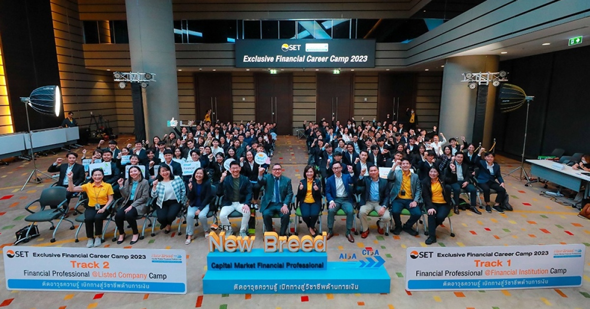 ตลาดหลักทรัพย์ฯ เตรียมความพร้อมเยาวชนระดับอุดมศึกษาสู่วิชาชีพด้านการเงิน ผ่านโครงการ 'New Breed Capital Market Financial Professionals 2023' ต่อเนื่องเป็นปีที่ 3 มีนิสิตนักศึกษาสนใจเข้าร่วมกว่า 2,600 คน จาก 86 มหาวิทยาลัยทั่วประเทศ เรียนรู้แบบเข้มข้นเจาะลึกการวิเคราะห์ทางการเงินและการจัดการลงทุน และรับทุน สอบผ่านหลักสูตร AISA ทั้งนี้ มีผู้ผ่านคัดเลือก 100 คน เข้าร่วมกิจกรรม Exclusive Financial Career Camp จัดขึ้นระหว่าง 15-18 มิ.ย. 2566 เพื่อสัมผัสโลกธุรกิจและการทำงานของมืออาชีพผ่านการเยี่ยมชมกิจการ พร้อมเติมเต็มความรู้และพัฒนาตนเองสู่วิชาชีพสายการเงิน โดยมี ศรพล ตุลยะเสถียร รองผู้จัดการ และพรรณวดี ลดาวัลย์ ณ อยุธยา ผู้ช่วยผู้จัดการ ตลาดหลักทรัพย์ฯ พร้อมด้วย ผู้บริหารบริษัท เอสซีจี เจดับเบิ้ลยูดี โลจิสติกส์ จำกัด (มหาชน) บริษัท เลคชอร์ แคปปิตอล พาร์ทเนอร์ส จำกัด และบริษัท สุรีย์ อินเตอร์ฟู้ดส์ จำกัด ร่วมเป็นกรณีศึกษาและให้โอกาสเข้าเยี่ยมชมกิจการ รวมถึงผู้แทนสมาคมบริษัทหลักทรัพย์ไทย และสมาคมบริษัทจดทะเบียน ร่วมเป็นคณะกรรมการตัดสินการแข่งขันกรณีศึกษา โครงการดังกล่าวเป็นการทำงานร่วมกันระหว่างภาคตลาดทุนเพื่อสร้างผู้ประกอบวิชาชีพด้านการเงินรุ่นใหม่ให้มีความรู้และทักษะที่ตอบโจทย์ความต้องการของตลาดทุนในอนาคต