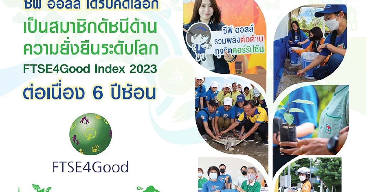 FTSE Russell เผยรายชื่อ FTSE4Good Index 2023 'ซีพี ออลล์' ได้รับเลือกต่อเนื่องเป็นปีที่ 6 มีคะแนนเฉลี่ยสูงกว่าค่าเฉลี่ยอุตสาหกรรมทุกมิติ สะท้อนการเป็นองค์กรแห่งความยั่งยืนที่ปลูกฝังวัฒนธรรมยาวนานกว่า 30 ปี