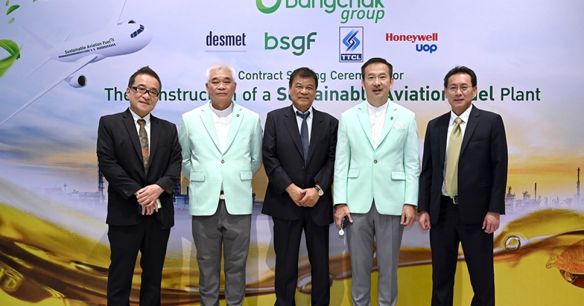 ในวันนี้ ถือเป็นก้าวสำคัญที่ได้มีพิธีลงนามสัญญาก่อสร้างหน่วยผลิตน้ำมันเชื้อเพลิงอากาศยานยั่งยืนจากน้ำมันพืชใช้แล้ว SAF รายแรกและรายเดียวในประเทศไทย ระหว่าง บริษัท บีเอสจีเอฟ จำกัด บริษัทร่วมทุนระหว่าง บริษัท บางจาก คอร์ปอเรชั่น จำกัด (มหาชน) บริษัท บีบีจีไอ จำกัด (มหาชน) และบริษัท ธนโชค ออยล์ ไลท์ จำกัด กับ บริษัท ทีทีซีแอล จำกัด (มหาชน) ผู้ดำเนินธุรกิจให้บริการด้านการออกแบบวิศวกรรมและก่อสร้างโรงงานจากประเทศญี่ปุ่น ซึ่งมีประสบการณ์ในการทำธุรกิจกับบางจากฯ มากว่า 20 ปี