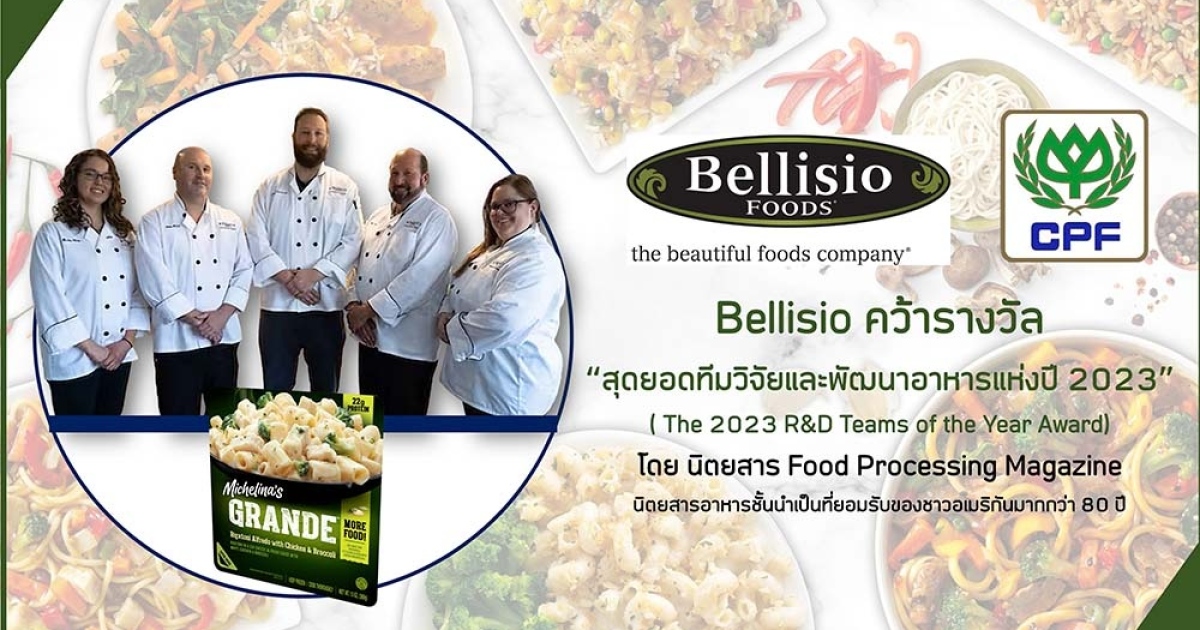 บริษัท เบลลิซิโอ ฟู้ด อิ้งค์ (Bellisio) ผู้นำด้านการผลิตอาหารสำเร็จรูปพร้อมรับประทานในสหรัฐอเมริกา ในกลุ่มบริษัท เจริญโภคภัณฑ์อาหาร จำกัด (มหาชน) หรือ ซีพีเอฟ คว้ารางวัลสุดยอดทีมวิจัยและพัฒนาอาหารแห่งปี 2023 ( The 2023 R&D Teams of the Year Award) มอบโดย นิตยสาร Food Processing Magazine นิตยสารอาหารชั้นนำเป็นที่ยอมรับของชาวอเมริกันมากกว่า 80 ปี จากความสำเร็จในการพัฒนาผลิตภัณฑ์อาหารสำเร็จรูปพร้อมทานแบรนด์ Michelina’s Grande ที่ตอบรับความต้องการของผู้บริโภคที่เปลี่ยนแปลงอย่างรวดเร็วในช่วงการระบาดโควิด 19