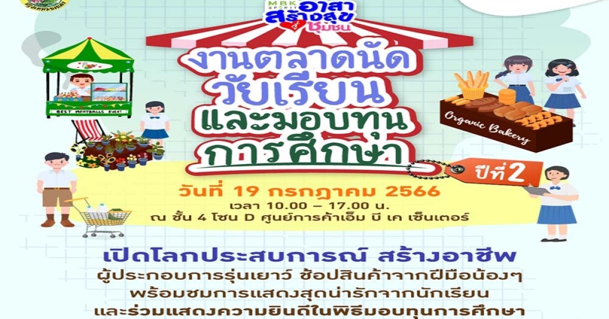 ศูนย์การค้าเอ็ม บี เค เซ็นเตอร์ สานต่อโครงการ MBK SPIRIT อาสาสร้างสุขสู่ชุมชน จัดงาน ตลาดนัดวัยเรียน ปีที่ 2 เปิดพื้นที่การเรียนรู้นอกห้องเรียนส่งเสริมให้เด็กนักเรียนจากโรงเรียนต่าง ๆ ในเขตปทุมวัน นำผลงานฝีมือมาวางจำหน่าย เสริมประสบการณ์สร้างอาชีพผู้ประกอบการรุ่นเยาว์ ในวันพุธที่ 19 กรกฎาคม 2566 ตั้งแต่เวลา 10.00 น – 17.00 น. ชั้น 4 โซน D