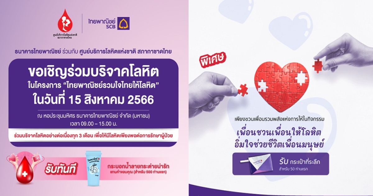 ธนาคารไทยพาณิชย์ ร่วมกับ ศูนย์บริการโลหิตแห่งชาติ สภากาชาดไทย ขอเชิญร่วมบริจาคโลหิต ภายใต้โครงการ “ไทยพาณิชย์รวมใจไทยให้โลหิต” ในวันอังคารที่ 15 สิงหาคม 2566 เวลา 9.00-15.00 น. ณ หอประชุมมหิศร ธนาคารไทยพาณิชย์ สำนักงานใหญ่ (รัชโยธิน) เพื่อแบ่งปันต่อเพื่อนมนุษย์ และเติมเต็มปริมาณโลหิตให้มีเพียงพอต่อการรักษาพยาบาลผู้ป่วยทั่วประเทศ สำหรับ 500 ท่านแรกที่ร่วมบริจาคโลหิต รับทันทีกระบอกน้ำลายกระต่ายแทนคำขอบคุณ และในครั้งนี้ธนาคารได้จัดกิจกรรมพิเศษ “เพื่อนชวนเพื่อนให้โลหิต อิ่มใจช่วยชีวิตเพื่อนมนุษย์” เพียงชวนเพื่อนที่ไม่เคยบริจาคโลหิตมาร่วมเป็นผู้ให้โดยบริจาคโลหิตครั้งแรก จะได้รับกระเป๋าไทยพาณิชย์รวมใจไทยให้โลหิต ทั้งผู้ชวนและผู้บริจาคโลหิตครั้งแรกคนละ 1 ใบ พร้อมนำผลิตภัณฑ์ออร์แกนิก ผัก ผลไม้ และสินค้าแปรรูปต่าง ๆ จากตลาดสุขใจสัญจรมาให้เลือกซื้อภายในงาน เพื่อส่งเสริมสุขภาพที่ดีให้แก่ผู้บริจาคโลหิตทุกคน