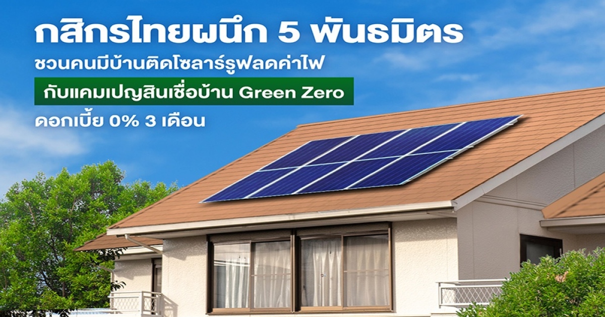 กสิกรไทยผนึกกำลัง 5 บริษัทชั้นนำด้านโซลาร์รูฟ ร่วมรักษ์โลกและลดค่าไฟฟ้าในยุคค่าไฟแพง กับแคมเปญสินเชื่อบ้าน Green Zero ให้ลูกค้าที่มีบ้าน ไม่ว่าจะเป็นบ้านปลอดภาระ บ้านที่กำลังผ่อนอยู่กับธนาคารกสิกรไทย หรือบ้านที่ผ่อนอยู่กับธนาคารอื่นและต้องการรีไฟแนนซ์มาที่ธนาคารกสิกรไทย ก็สามารถขอสินเชื่อเพื่อติดตั้งโซลาร์รูฟได้ง่ายๆ รับทันทีแพ็คเกจส่วนลดโซลาร์รูฟสูงสุดกว่า 20% อัตราดอกเบี้ย 0% นาน 3 เดือน ผ่อนสบายๆ นานสูงสุด 30 ปี