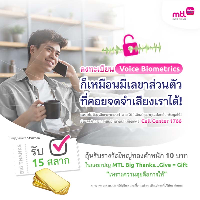 พิเศษ... สำหรับลูกค้าที่ลงทะเบียนยืนยันตัวตนด้วยเสียงได้สำเร็จ รับสิทธิ์ลุ้นรับรางวัลใหญ่ ทองคำแท่งหนัก 10 บาท และรางวัลอื่นๆ อีกมากมาย รวมมูลค่ากว่า 800,000 บาท ในแคมเปญ MTL Big Thanks…Give = Gift 'เพราะความสุขคือการให้' โดยสามารถรับสิทธิ์ได้แล้วตั้งแต่ วันนี้ ถึง 31 ธ.ค. 2566 จับสลากรางวัลภายในวันที่ 21 ก.พ. 2567 ณ เมืองไทยประกันชีวิต สำนักงานใหญ่ และประกาศรายชื่อผู้ได้รับรางวัลในวันที่ 28 ก.พ. 2567 ที่เว็บไซต์ www.muangthai.co.th