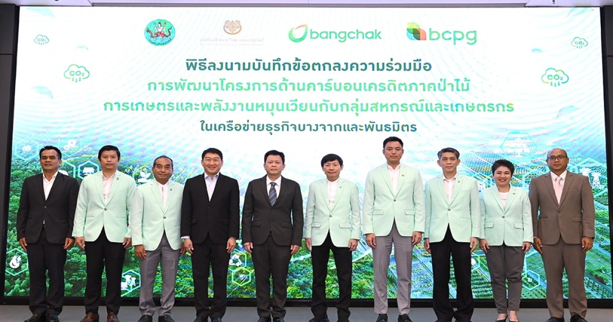 นายสมชัย เตชะวณิช ประธานเจ้าหน้าที่การตลาด กลุ่มธุรกิจการตลาด บริษัท บางจาก คอร์ปอเรชั่น จำกัด (มหาชน) นายวิศิษฐ์ ศรีสุวรรณ์ อธิบดีกรมส่งเสริมสหกรณ์ นายประเสริฐ ตรงเจริญเกียรติ ประธานสายปฏิบัติการ/ธุรกิจเพื่อสังคม มูลนิธิแม่ฟ้าหลวง ในพระบรมราชูปถัมภ์ และ นายชาญวิทย์ ตรังอดิศัยกุล รองกรรมการผู้จัดการใหญ่ สายงานการลงทุน บริษัท บีซีพีจี จำกัด (มหาชน) ร่วมลงนามในบันทึกข้อตกลง “การพัฒนาโครงการด้านคาร์บอนเครดิตภาคป่าไม้ การเกษตรและพลังงานหมุนเวียนกับกลุ่มสหกรณ์และเกษตรกรในเครือข่ายธุรกิจ บางจากฯ และพันธมิตร” เพื่อสนับสนุนความร่วมมือ ประชาสัมพันธ์ ส่งเสริม แลกเปลี่ยนข้อมูล ความรู้ เทคโนโลยี บุคลากร กระบวนการจัดการในโครงการด้านคาร์บอนเครดิตภาคป่าไม้ การเกษตรและพลังงานหมุนเวียนกับกลุ่มสหกรณ์และเกษตรกรในเครือข่ายธุรกิจบางจากฯ และพันธมิตร ให้สอดคล้องกับโครงการลดก๊าซเรือนกระจกภาคสมัครใจตามมาตรฐานของประเทศไทย (T-VER) ผ่านกิจกรรม ในแปลงพืชเกษตรยืนต้น ได้แก่ ยางพารา ปาล์มน้ำมัน ไม้ผล เป็นต้น และการผลิตไฟฟ้าจากพลังงานหมุนเวียนเพื่อใช้เองเพื่อลดต้นทุนทางการผลิต สนับสนุนการใช้พลังงานสะอาด สร้างมูลค่าเพิ่มและคุณค่าร่วมจากกระบวนการคาร์บอนเครดิตที่เกิดขึ้น