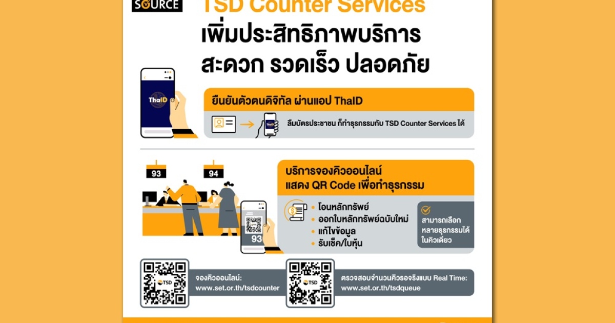 ศูนย์รับฝากหลักทรัพย์ฯ เพิ่มประสิทธิภาพการให้บริการ TSD Counter Services ที่อาคารตลาดหลักทรัพย์ฯ ถ.รัชดาภิเษก โดยผู้ถือหุ้นสามารถใช้บัตรประชาชนดิจิทัลยืนยันตัวตนผ่านแอปพลิเคชัน ThaID (ไทยดี) ของกรมการปกครอง ในการเข้ารับบริการด้วยความสะดวกมากขึ้น พร้อมปรับปรุงบริการจองคิวออนไลน์ล่วงหน้า ผ่านเว็บไซต์ https://www.set.or.th/tsdcounter โดยเพิ่มคิวอาร์โค้ด (QR Code) สำหรับสแกนรับคิวเพื่อเข้ารับบริการ และสามารถเลือกหลายธุรกรรมได้ในคิวเดียว นอกจากนี้ ยังสามารถตรวจสอบการรอคิวแบบ Real Time ได้ที่ https://www.set.or.th/tsdqueue TSD Counter Services พร้อมให้บริการที่สะดวก รวดเร็ว และทันสมัยแล้ววันนี้