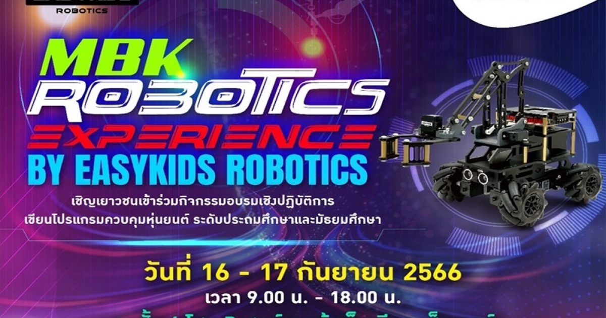 ศูนย์การค้าเอ็ม บี เค เซ็นเตอร์ สนับสนุนพื้นที่จัดกิจกรรมส่งเสริมการพัฒนาทักษะและศักยภาพ ต่อยอดการเรียนรู้เชิงนวัตกรรมให้เด็กและเยาวชน ชวนชมความสามารถของเด็ก ๆ ในงาน MBK Robotics Experience By Easykids Robotics กิจกรรมอบรมเชิงปฏิบัติการ EasyKids Coding & Robotics Workshop การประดิษฐ์หุ่นยนต์ และเขียนโปรแกรมควบคุมหุ่นยนต์เพื่อแข่งขันทำภารกิจต่าง ๆ ชิงถ้วยรางวัลระดับประถมศึกษาและมัธยมศึกษา จัดโดย ศูนย์การเรียนรู้การเขียนโปรแกรมและนวัตกรรมหุ่นยนต์ EasyKids Robotics ระหว่างวันเสาร์ที่ 16 – วันอาทิตย์ที่ 17 กันยายน 2566
