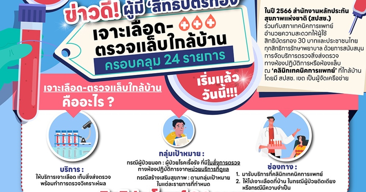 เริ่มแล้ววันนี้ ทางเลือกใหม่ “เจาะเลือด-ตรวจแล็บ ที่คลินิกแล็บใกล้บ้าน 24 รายการ” สปสช.จับมือสภาเทคนิคการแพทย์ รุกนโยบายบริการตรวจทางห้องปฏิบัติการหรือแล็บ ณ คลินิกเทคนิคการแพทย์ที่เข้าร่วมให้บริการใกล้บ้าน ช่วยเพิ่มความสะดวก ไม่ต้องรอนาน ได้รับบริการตรวจแล็บตามมาตรฐาน