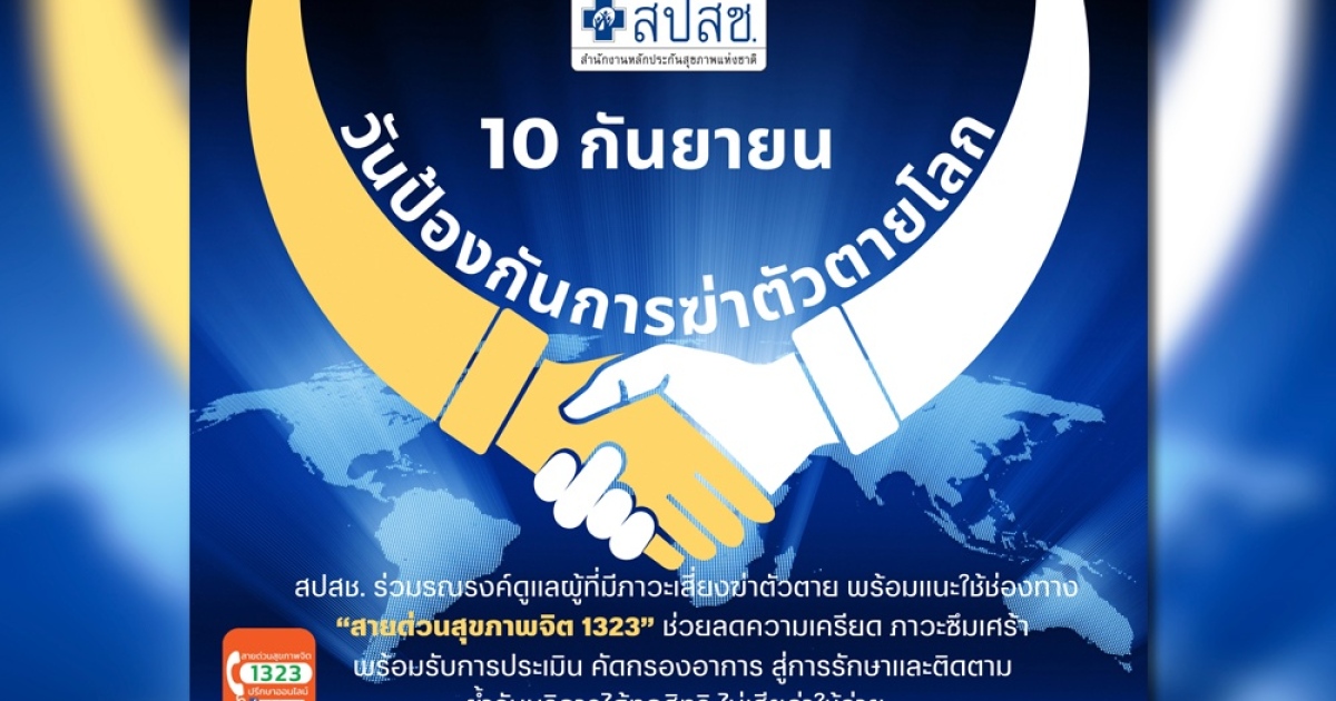 10 กันยายน วันป้องกันการฆ่าตัวตายโลก สปสช. ร่วมรณรงค์ดูแลผู้ที่มีภาวะเสี่ยงฆ่าตัวตาย พร้อมแนะใช้ช่องทาง “สายด่วนสุขภาพจิต 1323” ช่วยลดความเครียด ภาวะซึมเศร้า พร้อมรับการประเมิน คัดกรองอาการ สู่การรักษาและติดตาม ย้ำรับบริการได้ทุกสิทธิ ไม่เสียค่าใช้จ่าย