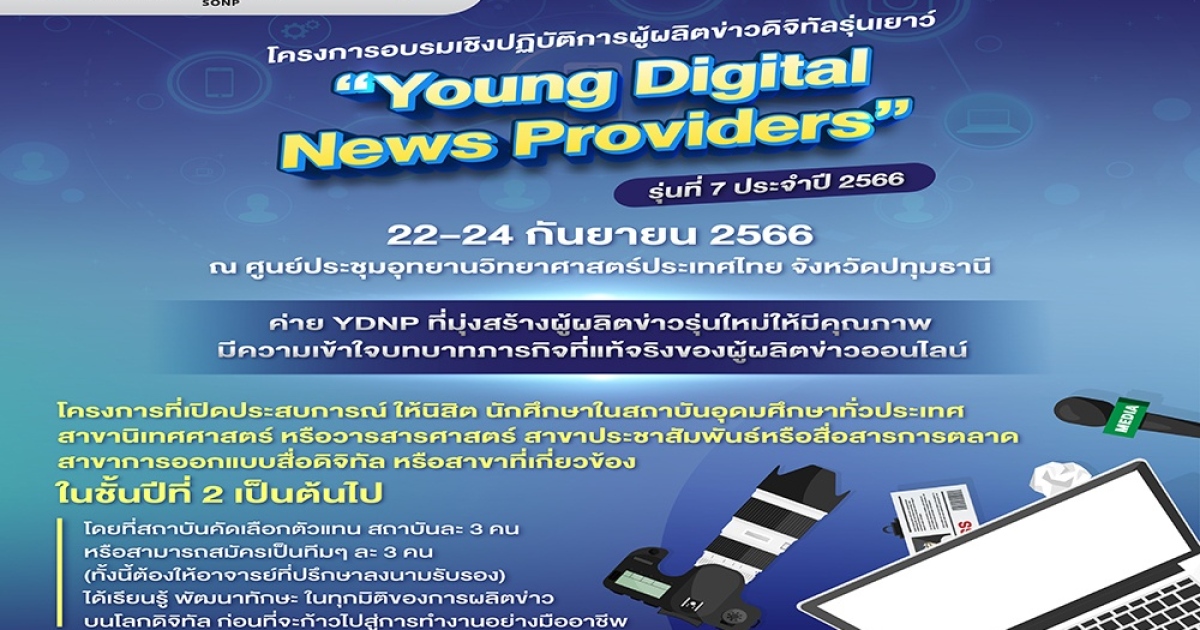 สมาคมผู้ผลิตข่าวออนไลน์ ร่วมกับ กองทุนพัฒนาสื่อปลอดภัยและสร้างสรรค์ จัด “โครงการอบรมเชิงปฏิบัติการผู้ผลิตข่าวดิจิทัลรุ่นเยาว์” หรือ “Young Digital News Providers” รุ่นที่ 7 ประจำปี 2566 ภายใต้ โครงการความร่วมมือองค์กรสื่อขับเคลื่อนพัฒนาวิชาชีพและส่งเสริมจริยธรรมสื่อเพื่อสร้างระบบนิเวศสื่อปลอดภัยและสร้างสรรค์ ในวันที่ 22-24 กันยายน 2566 ณ ศูนย์ประชุมอุทยานวิทยาศาสตร์ประเทศไทย จังหวัดปทุมธานี บริหารจัดการหลักสูตรโดย สมาคมผู้ผลิตข่าวออนไลน์ ได้รับทุนสนับสนุนจาก กองทุนพัฒนาสื่อปลอดภัยและสร้างสรรค์ ซึ่งมีวัตถุประสงค์เพื่อถ่ายทอดความรู้ในทุกมิติของการผลิตข่าวบนโลกดิจิทัล อาทิ ทิศทางในการนำเสนอข่าวสารและพฤติกรรมของผู้บริโภคยุคดิจิทัล, การใช้เครื่องมือบนเครือข่ายสังคมออนไลน์อย่างมีประสิทธิภาพ, การนำเสนอในรูปแบบมัลติมีเดีย, เรียนรู้จริยธรรมการนำเสนอข่าวที่ถูกต้องและเหมาะสม, การวางแผนการตลาดและประชาสัมพันธ์เว็บไซต์ข่าว และสื่อสังคมออนไลน์ อีกทั้งจัดให้มีการประกวด “เว็บไซต์ข่าวฝึกปฏิบัติยอดเยี่ยมระดับอุดมศึกษา” โดย นิสิต นักศึกษาส่งผลงานจริงเข้าประกวดหลังจากได้รับการฝึกอบรมไปแล้ว เพื่อสร้างผู้ผลิตข่าวรุ่นใหม่ให้มีคุณภาพ ถูกต้อง และมีความเข้าใจบทบาทภารกิจที่แท้จริงของผู้ผลิตข่าวออนไลน์ ก่อนที่จะก้าวไปสู่การทำงานอย่างมืออาชีพ