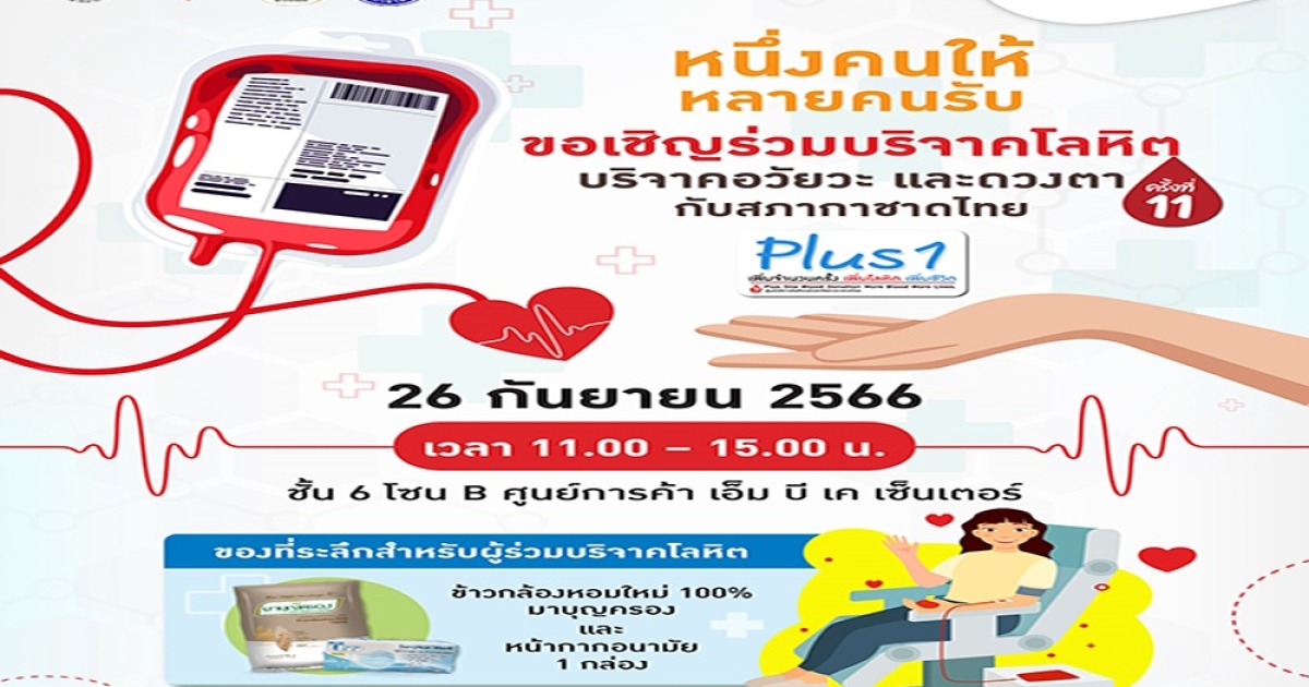 เตรียมร่างกายให้พร้อม!! ศูนย์การค้าเอ็ม บี เค เซ็นเตอร์ ร่วมกับ ศูนย์บริการโลหิตแห่งชาติและศูนย์รับบริจาคอวัยวะ สภากาชาดไทย จัดกิจกรรม บริจาคโลหิต อวัยวะและดวงตา Plus 1 เพิ่มจำนวนครั้ง เพิ่มโลหิต เพิ่มชีวิต ครั้งที่ 11 ขอเชิญชวนร่วมบริจาคโลหิต ลงทะเบียนบริจาคอวัยวะและดวงตา ลงทะเบียนเป็นอาสาสมัครกาชาด ในวันอังคารที่ 26 กันยายน 2566 ตั้งแต่เวลา 11.00 น. – 15.00 น. ชั้น 6 โซน B พร้อมรับของที่ระลึกแทนคำขอบคุณเป็นผลิตภัณฑ์ข้าวบรรจุถุงมาบุญครอง ข้าวกล้องหอมใหม่ 100 % ขนาด 1 กิโลกรัม จำนวน 1 ถุง และ หน้ากากอนามัย 1 กล่อง